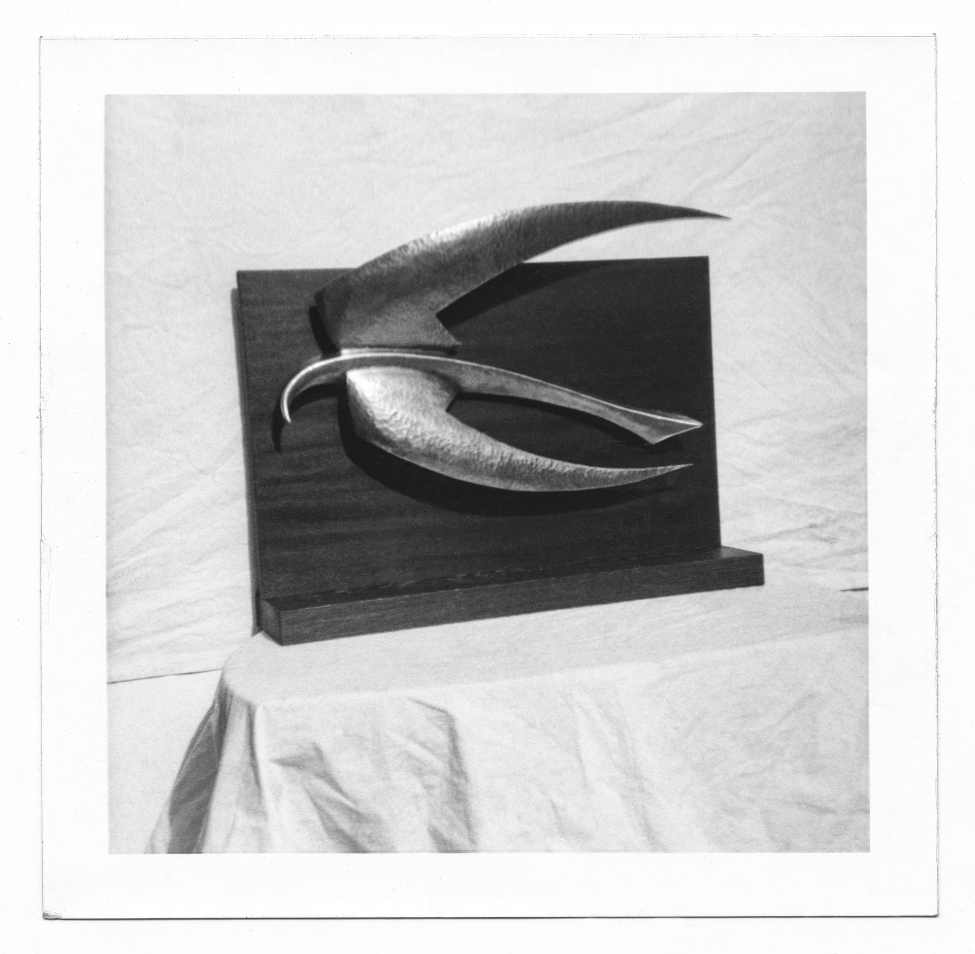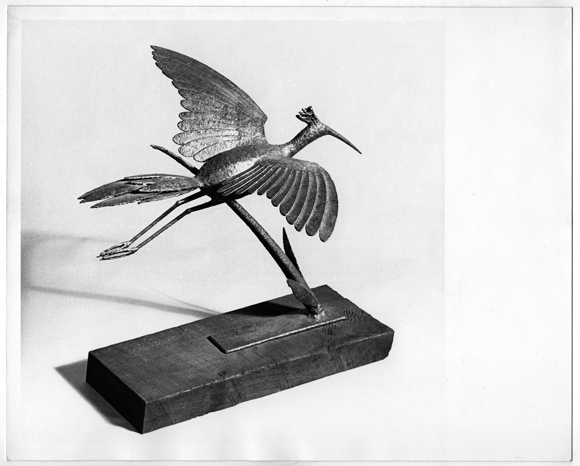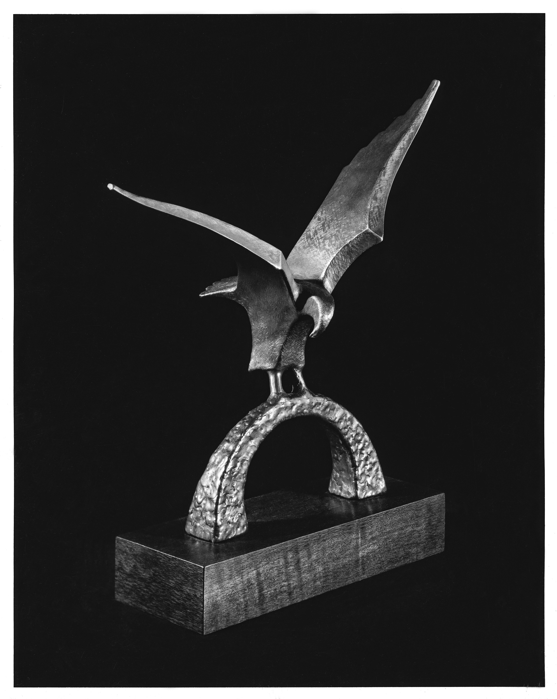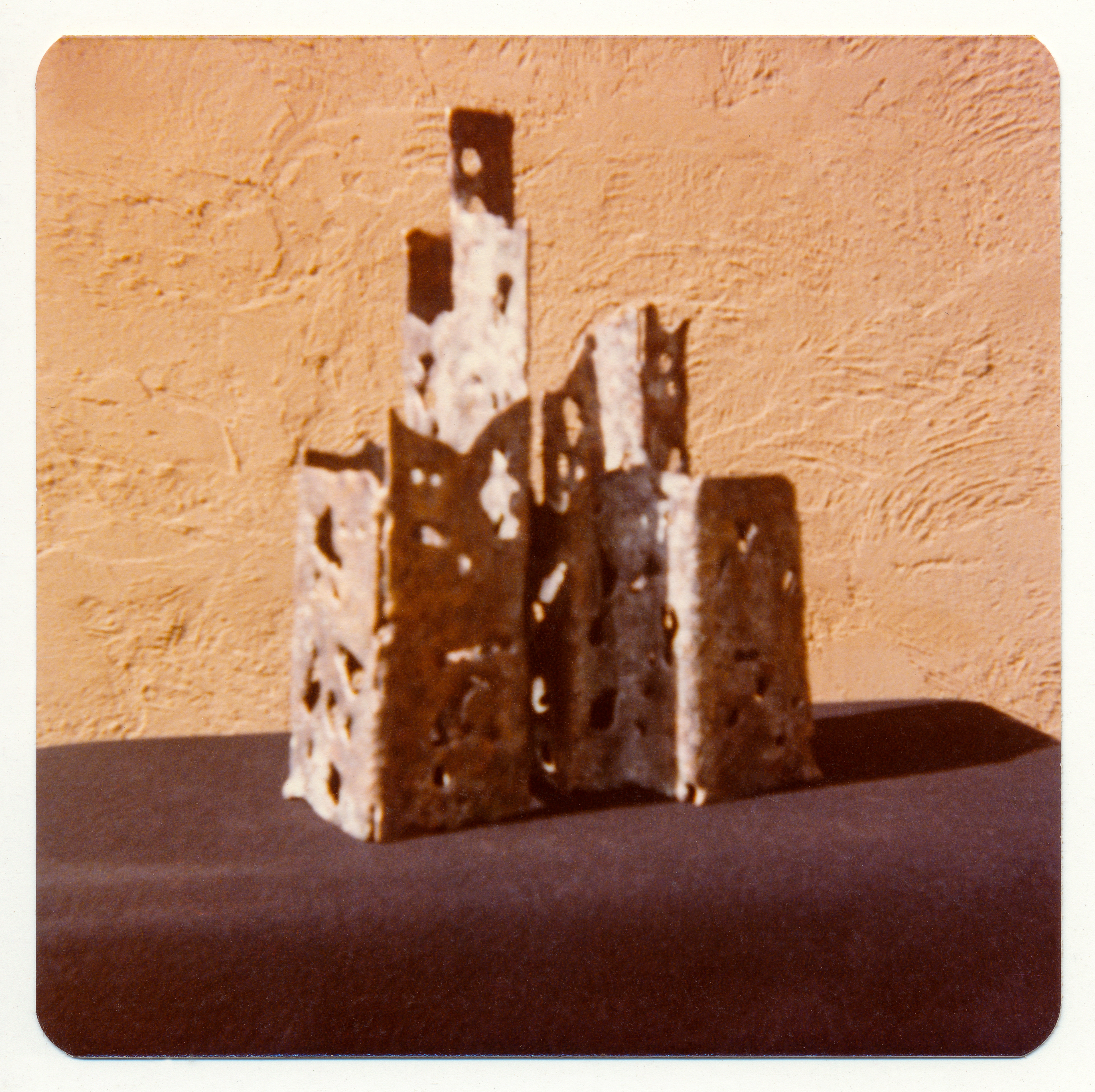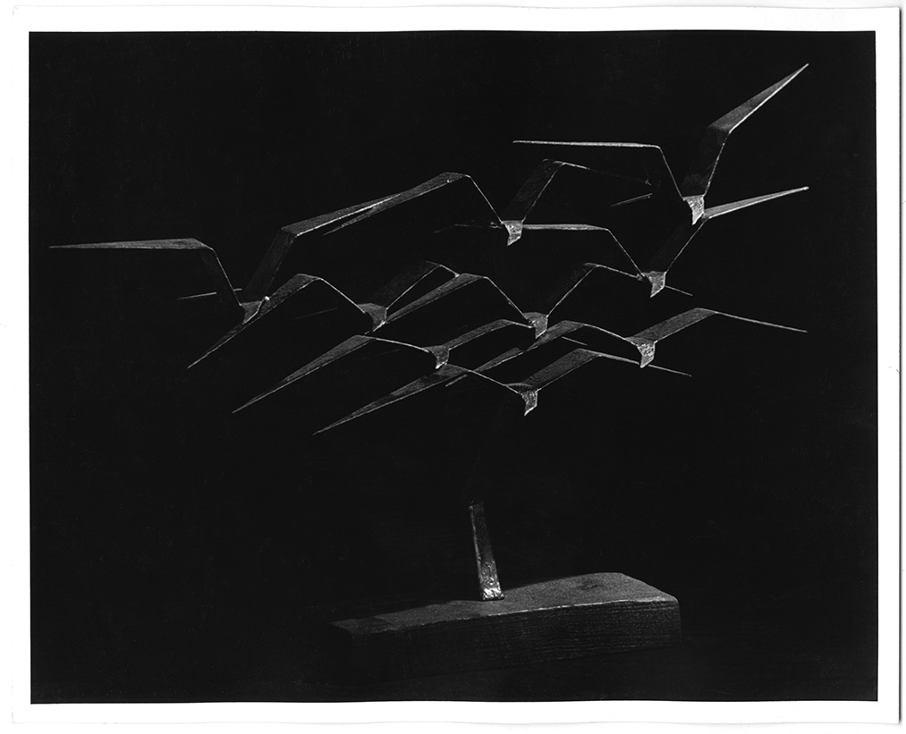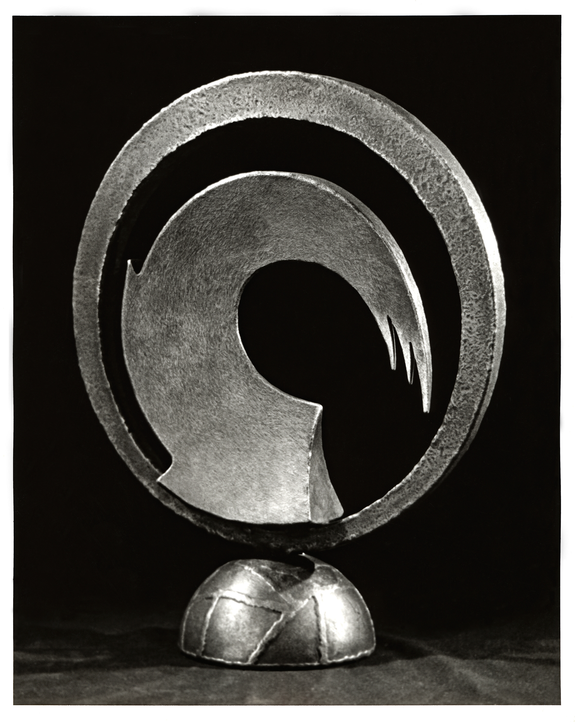 now band-saw this piece to shape. Repeat lay-out and sawing on an adjoining piece. now shape these pieces with hammer and anvil, or vise, or whatever is needed to obtain the required contours and fits. These two pieces might now be tacked together with the torch. The third piece, adjoining, now is cut out, shaped, and tacked in place on the first two pieces. This procedure continues until you have all the pieces in place. one sculpture may have an unlimited number of pieces.