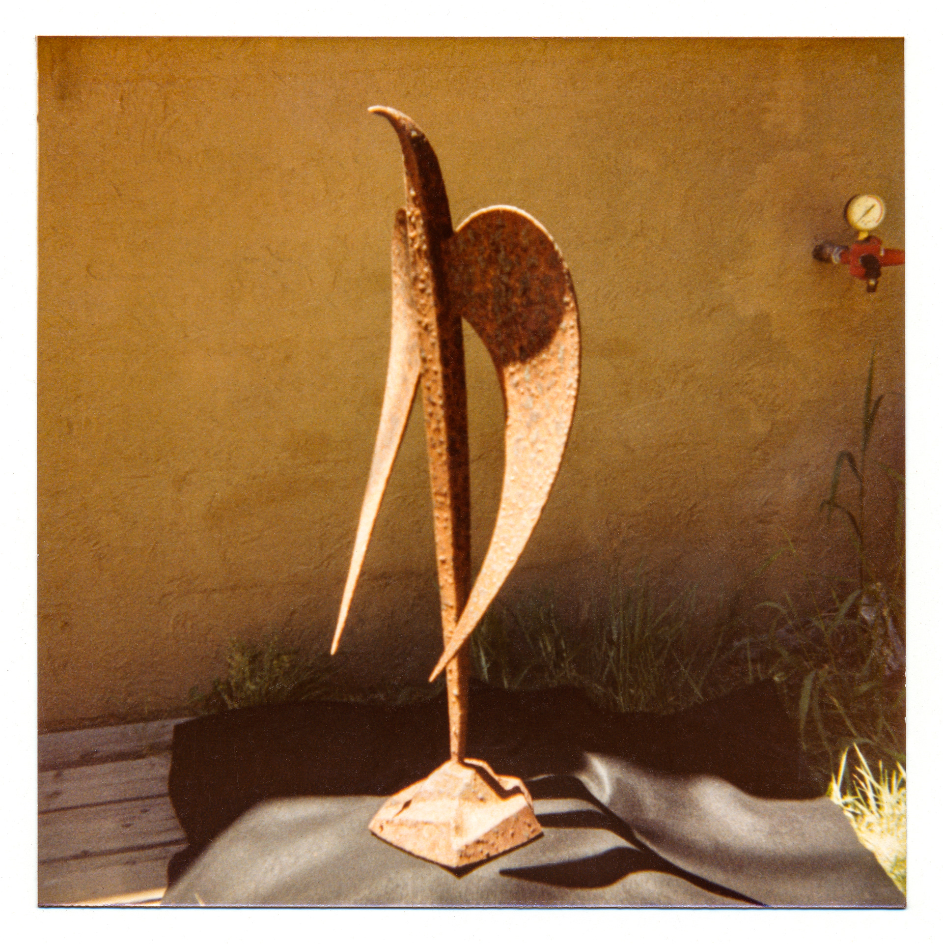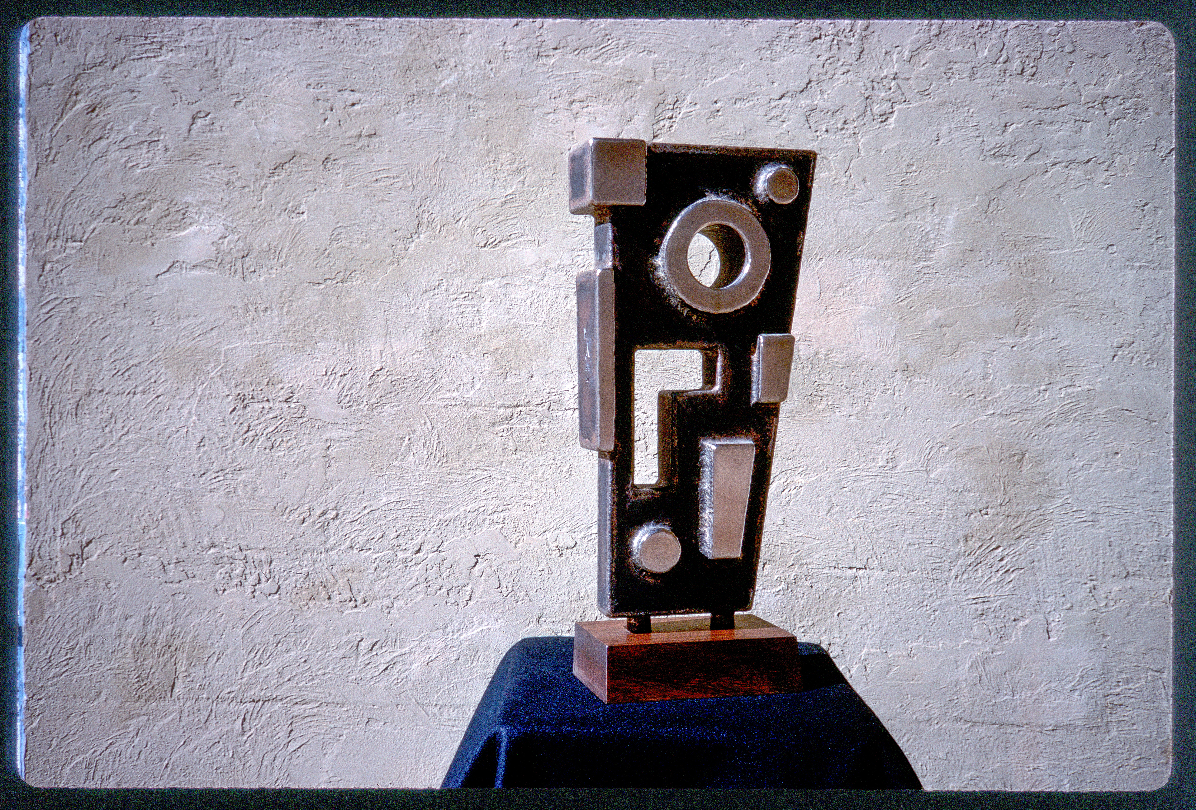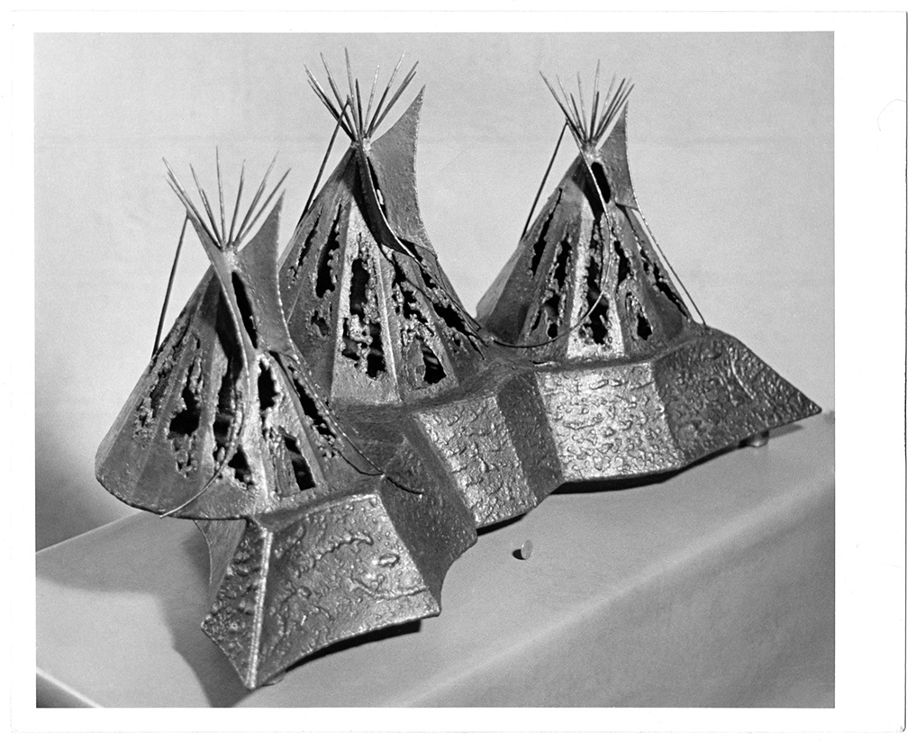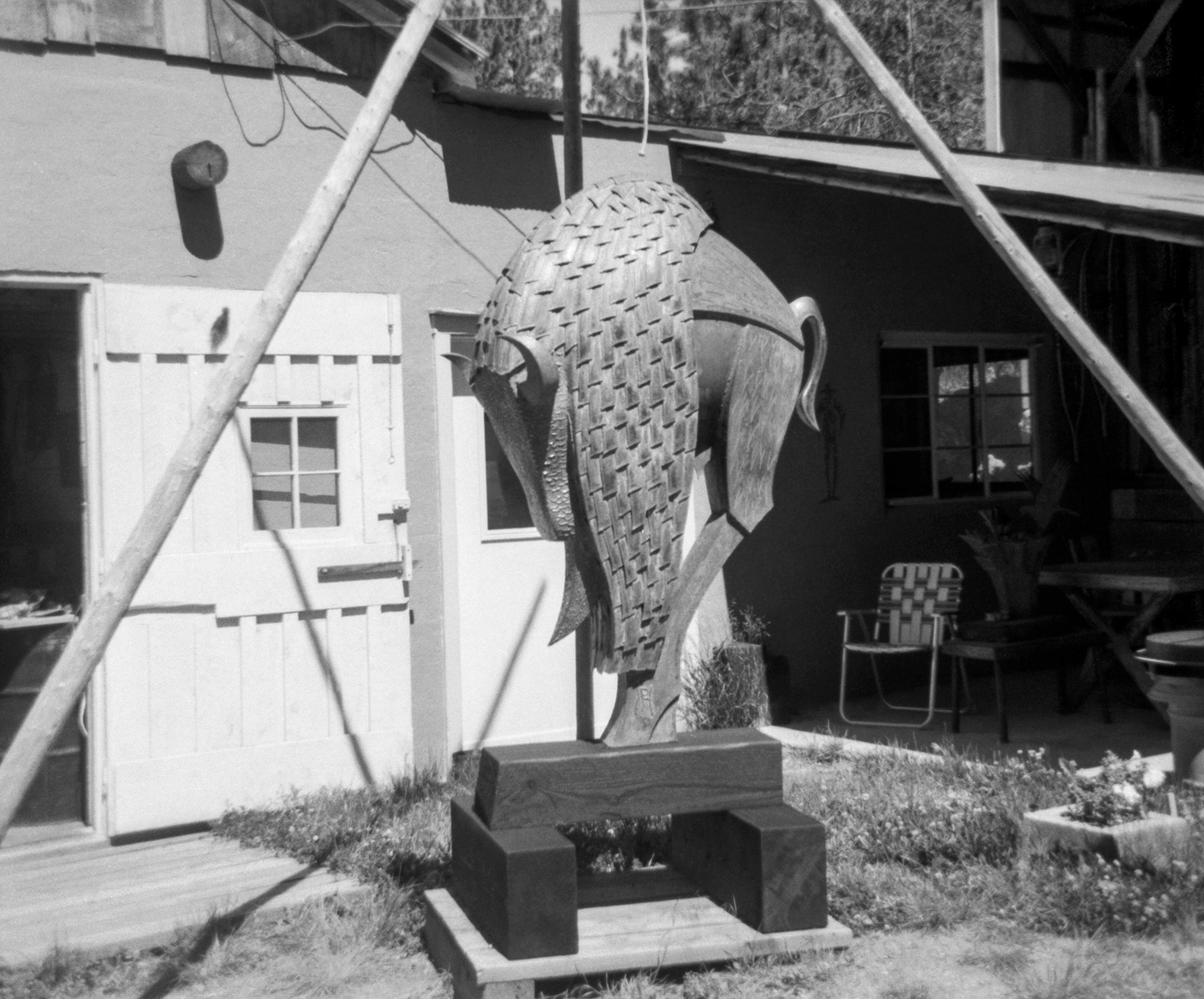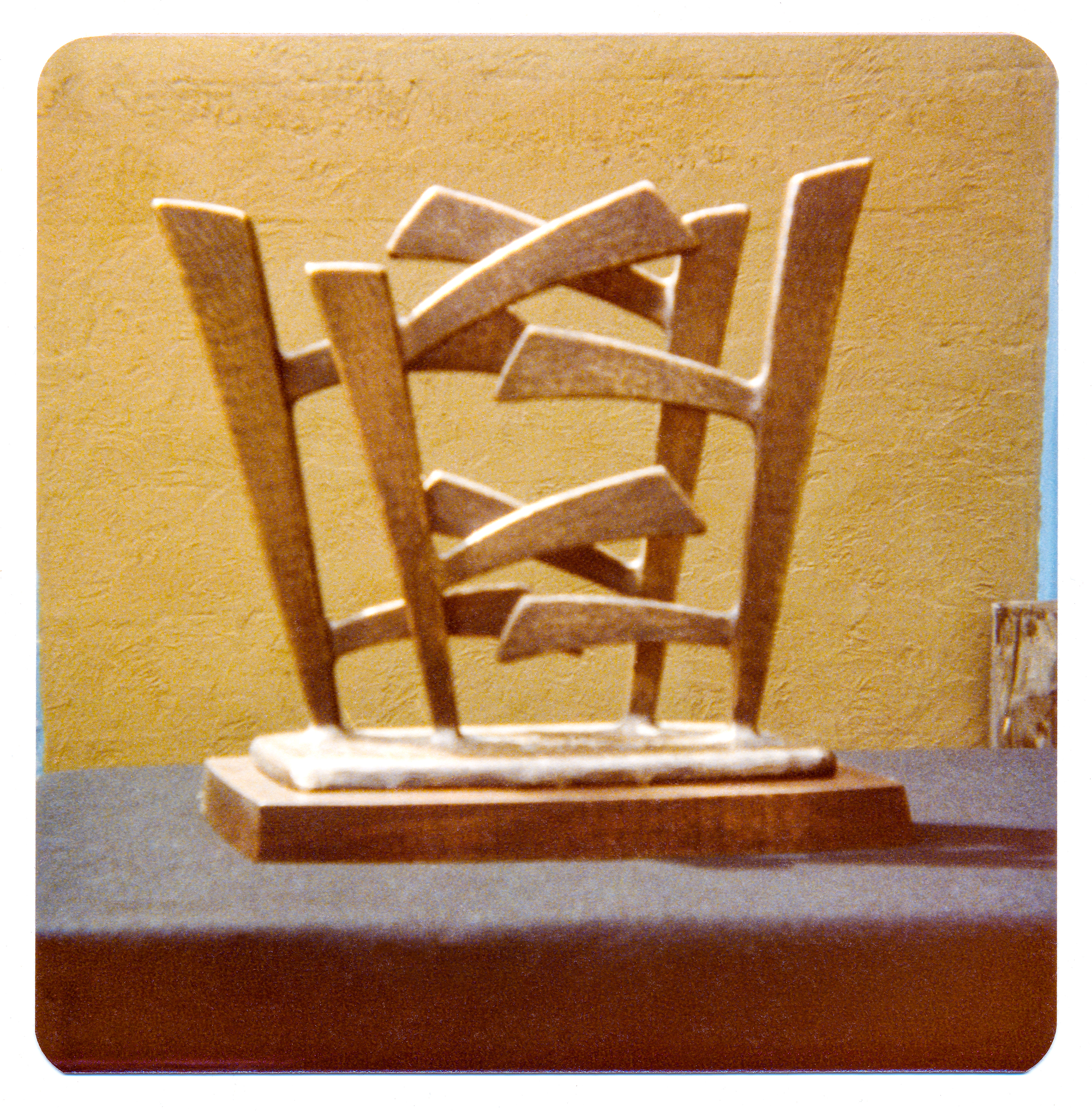 now band-saw this piece to shape. Repeat lay-out and sawing on an adjoining piece. now shape these pieces with hammer and anvil, or vise, or whatever is needed to obtain the required contours and fits. These two pieces might now be tacked together with the torch. The third piece, adjoining, now is cut out, shaped, and tacked in place on the first two pieces. This procedure continues until you have all the pieces in place. one sculpture may have an unlimited number of pieces.
