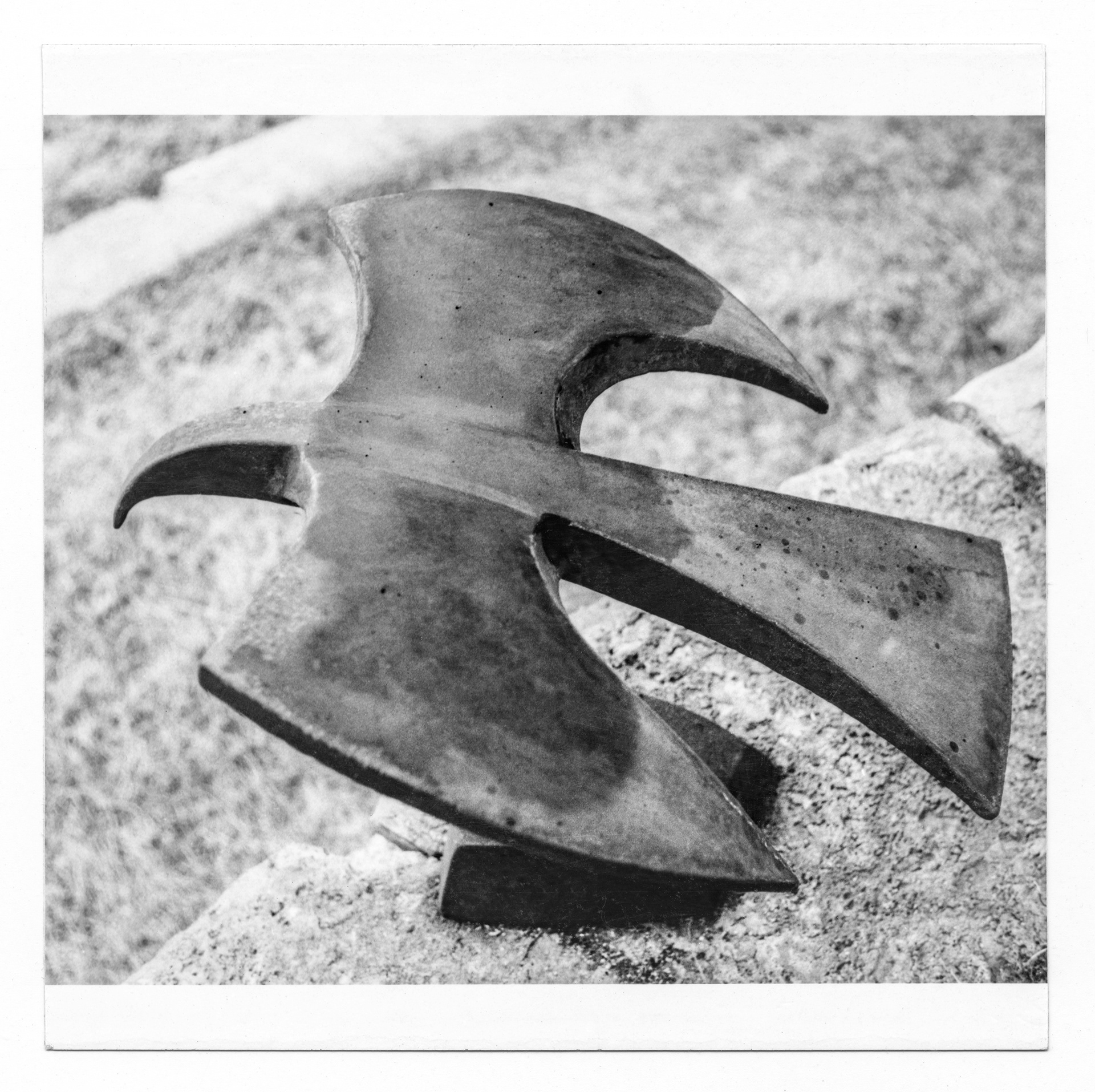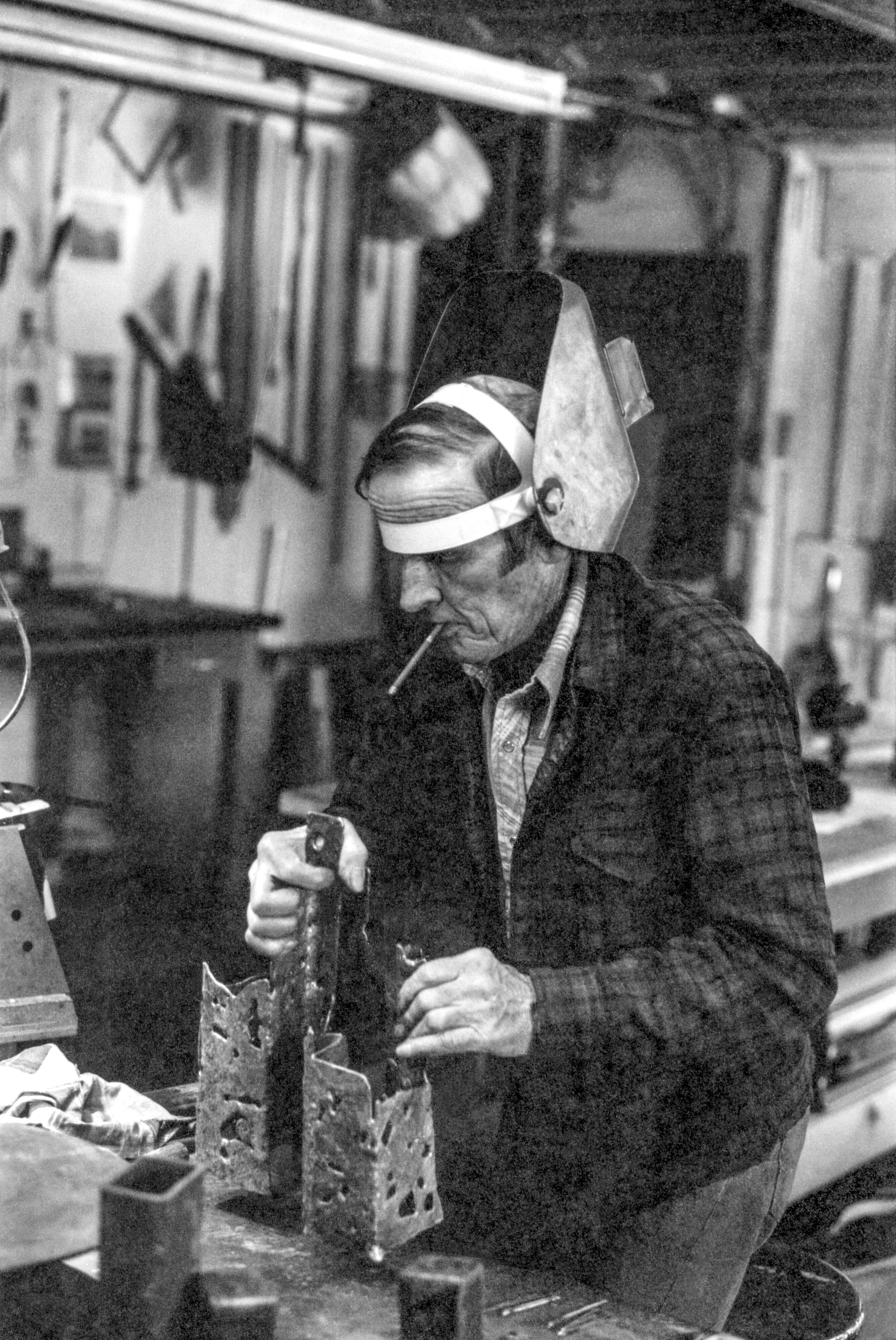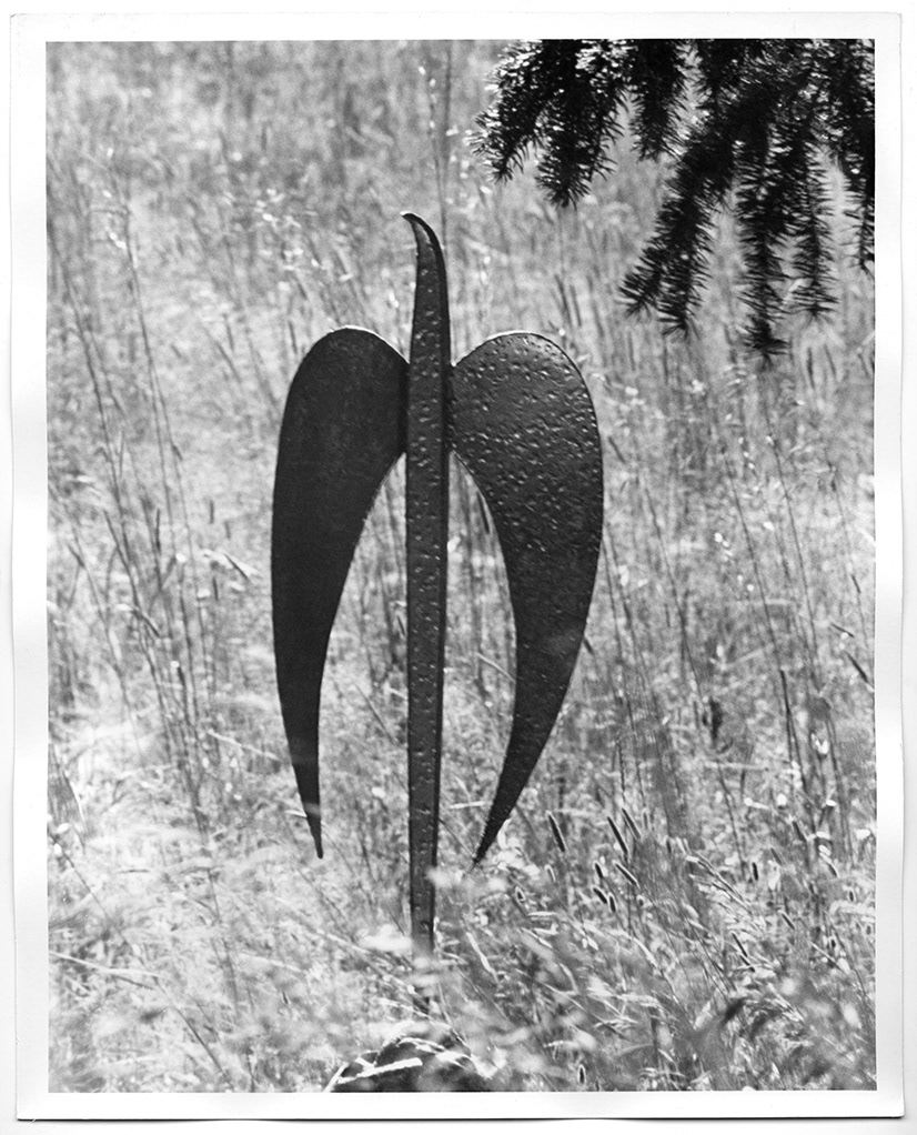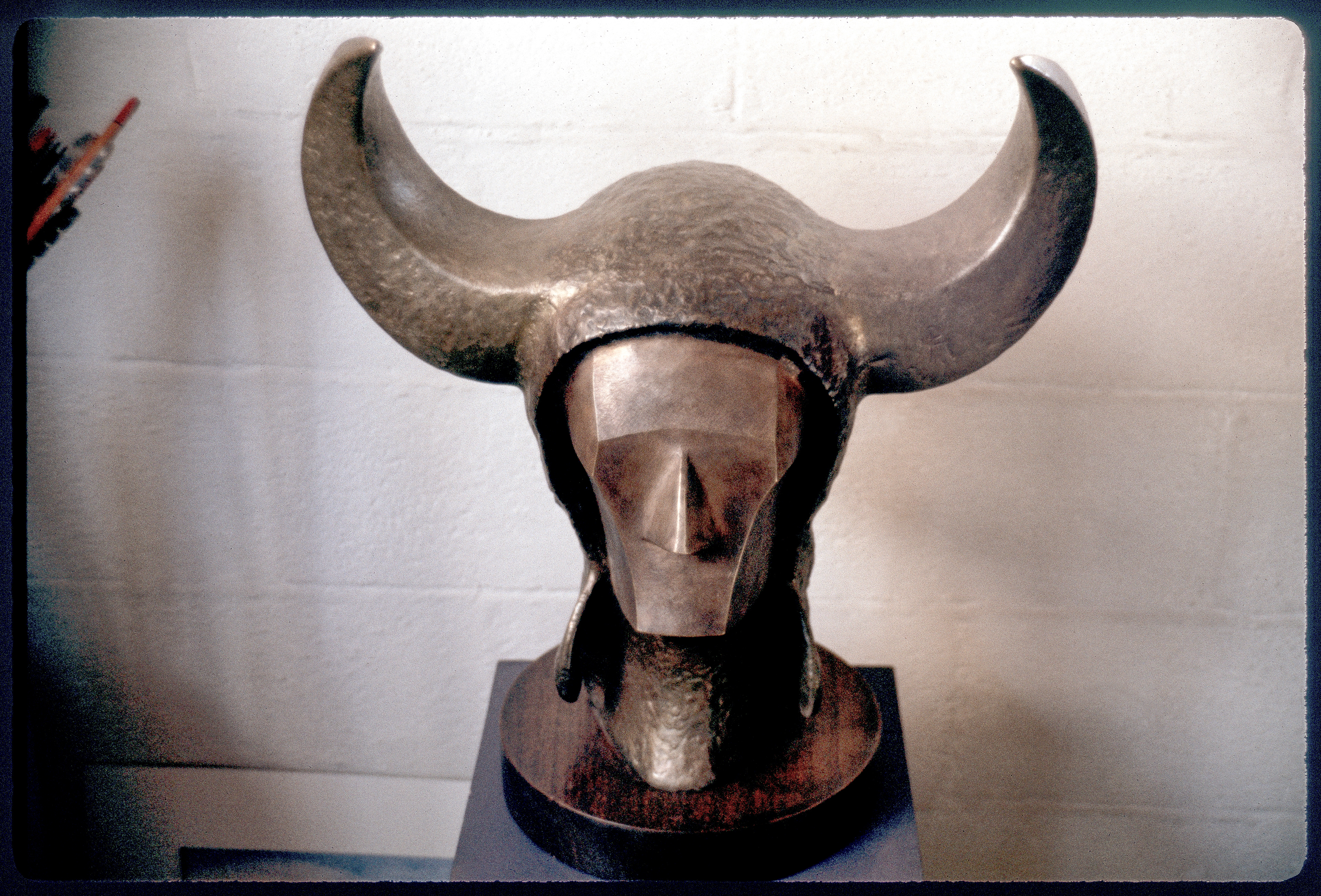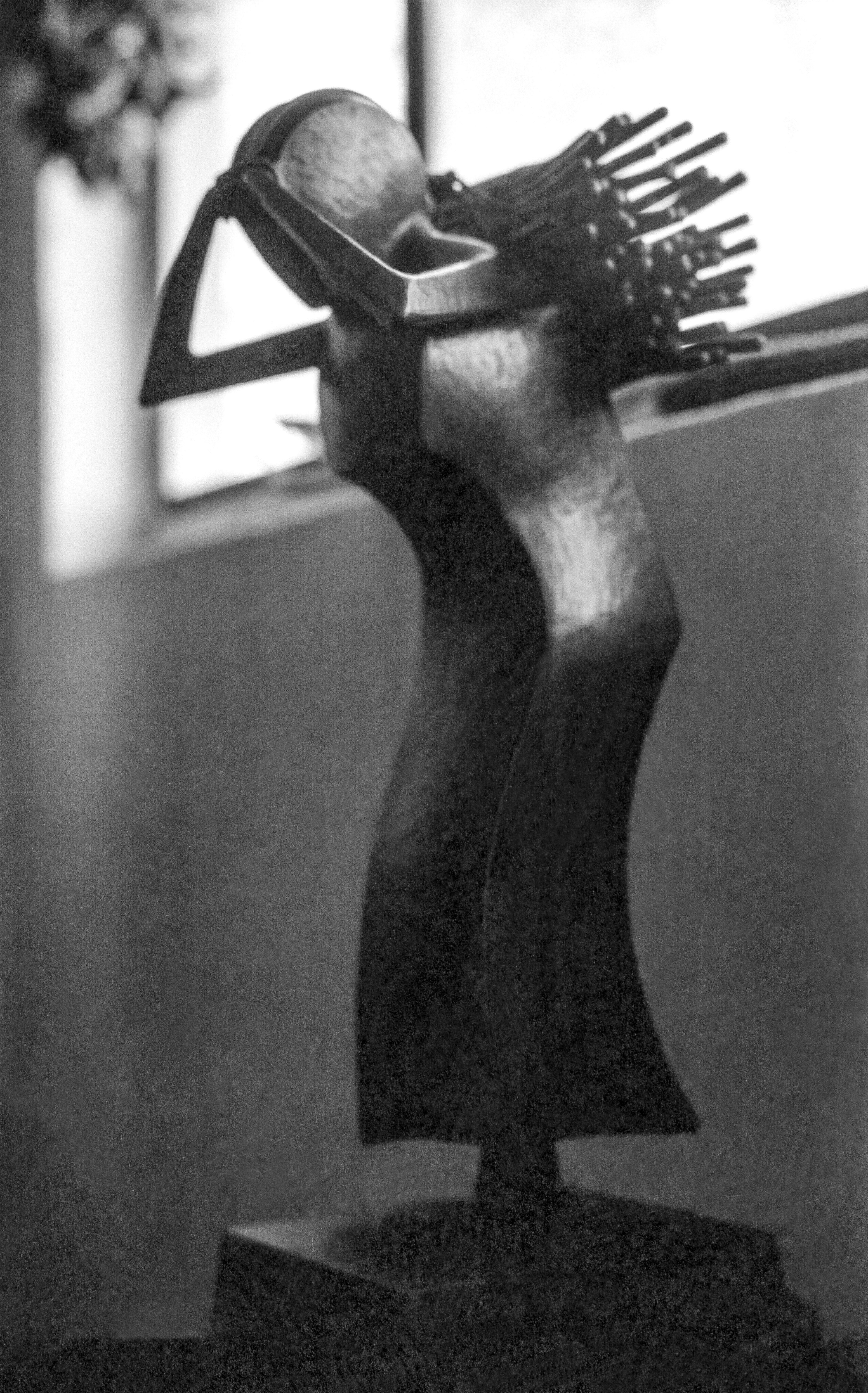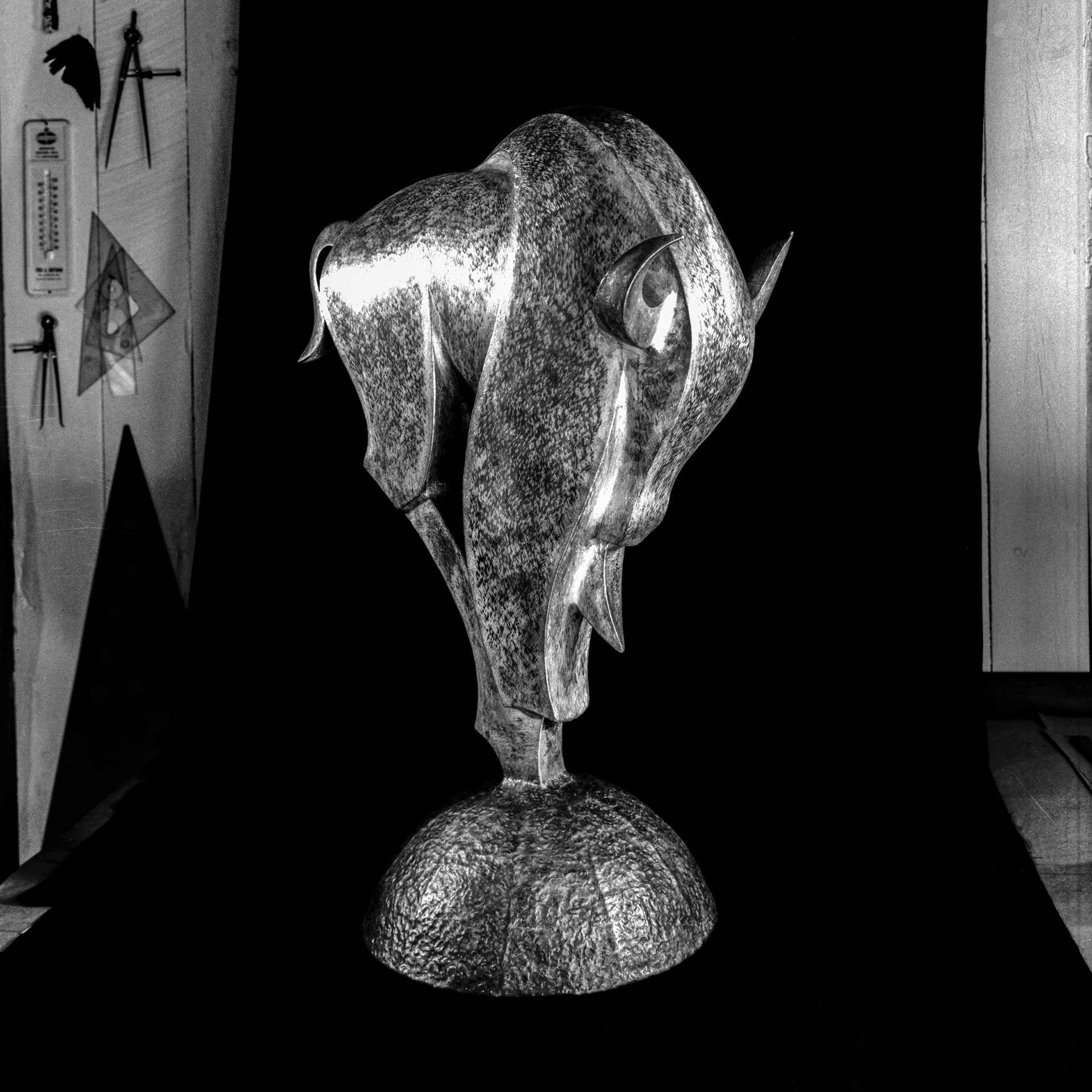 now band-saw this piece to shape. Repeat lay-out and sawing on an adjoining piece. now shape these pieces with hammer and anvil, or vise, or whatever is needed to obtain the required contours and fits. These two pieces might now be tacked together with the torch. The third piece, adjoining, now is cut out, shaped, and tacked in place on the first two pieces. This procedure continues until you have all the pieces in place. one sculpture may have an unlimited number of pieces.