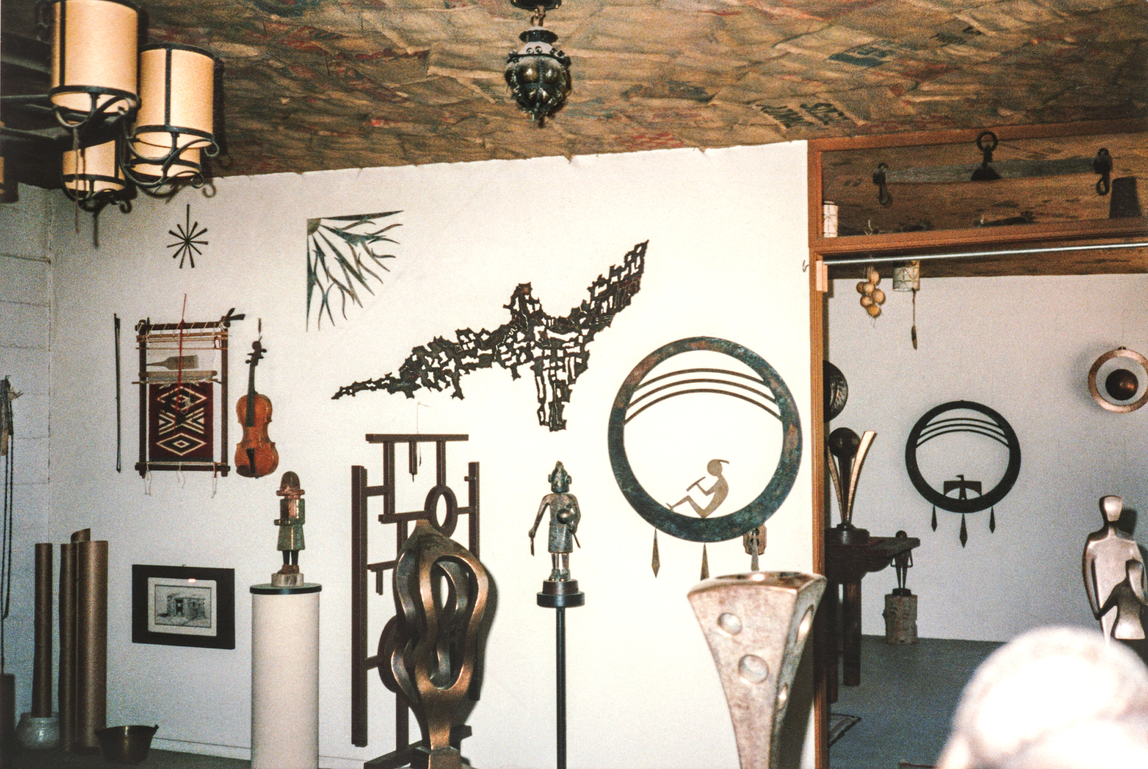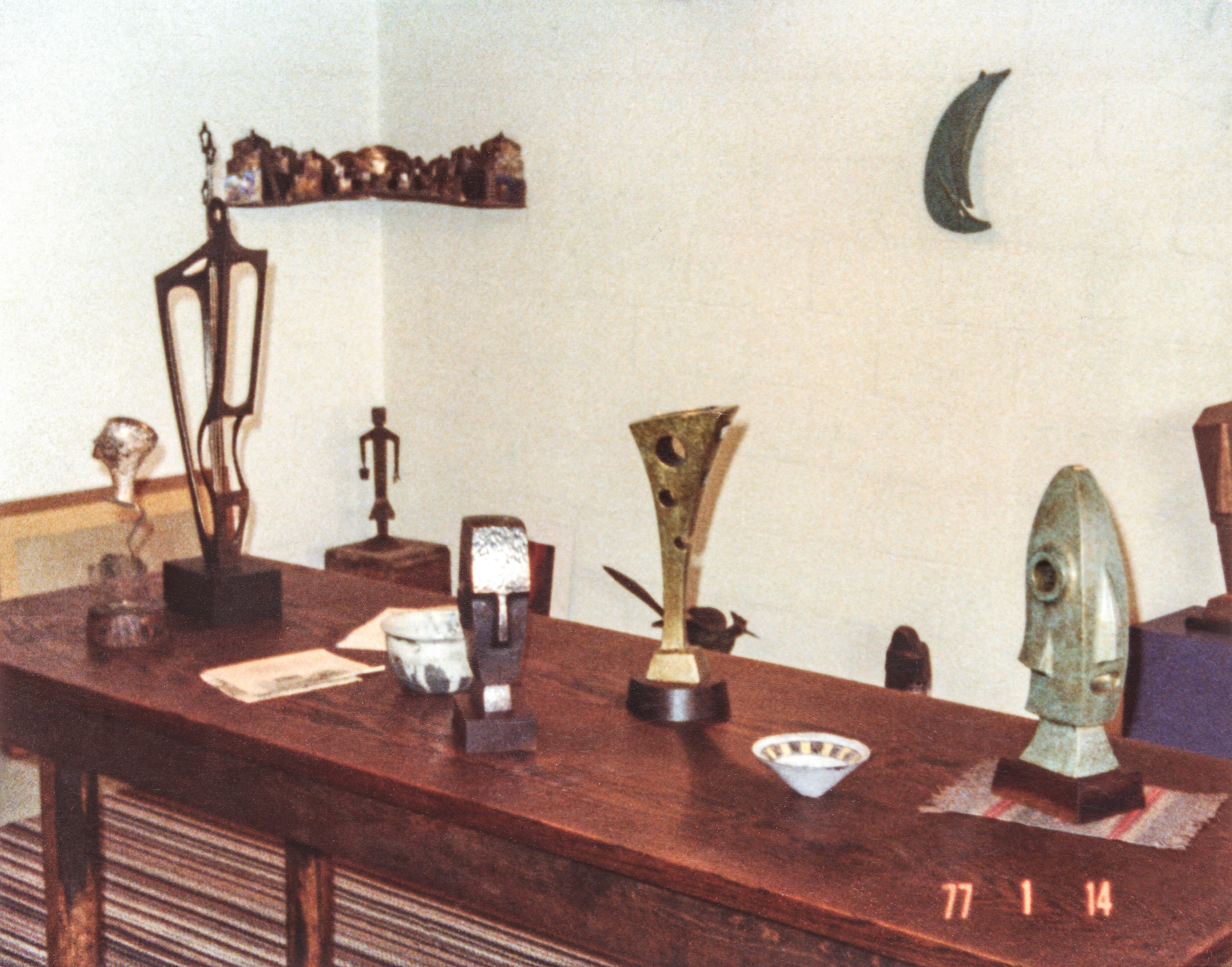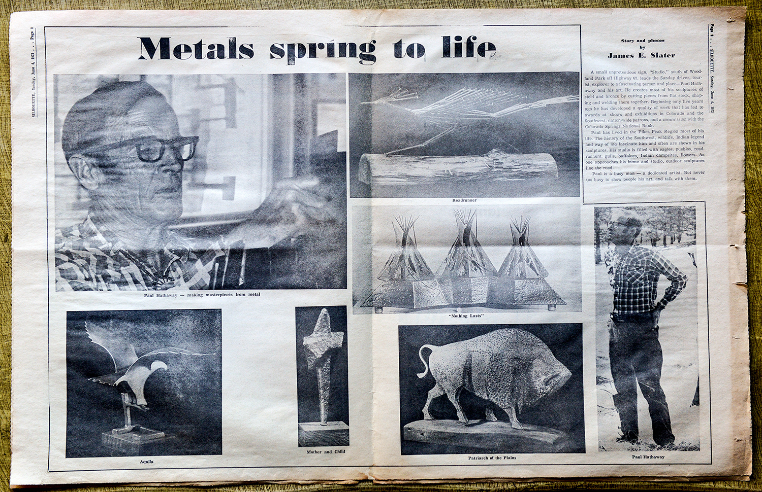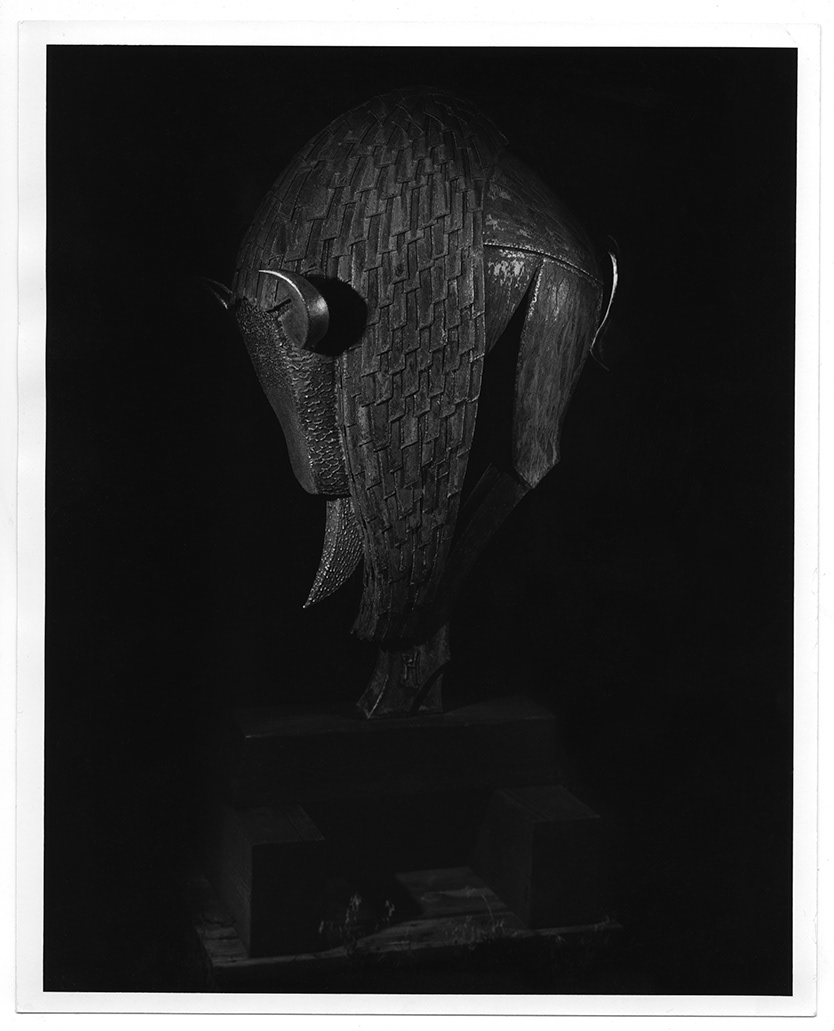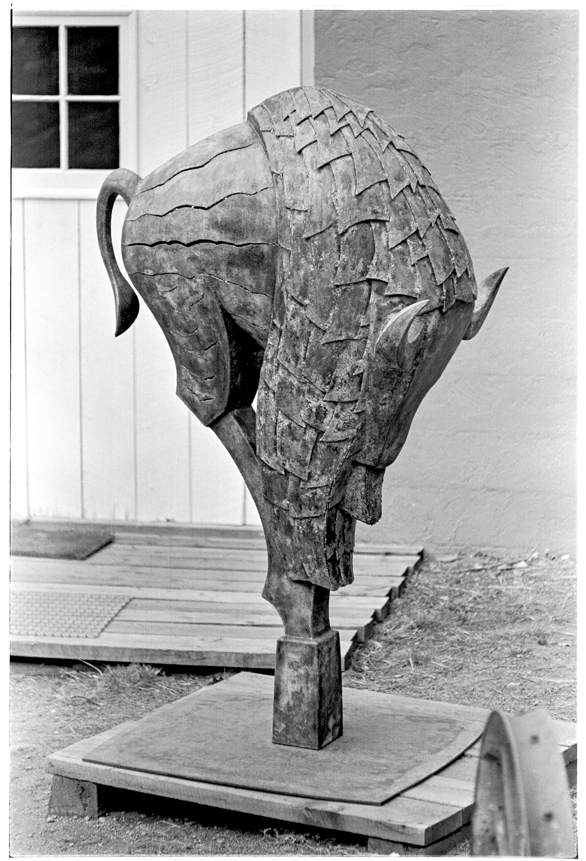 now band-saw this piece to shape. Repeat lay-out and sawing on an adjoining piece. now shape these pieces with hammer and anvil, or vise, or whatever is needed to obtain the required contours and fits. These two pieces might now be tacked together with the torch. The third piece, adjoining, now is cut out, shaped, and tacked in place on the first two pieces. This procedure continues until you have all the pieces in place. one sculpture may have an unlimited number of pieces.