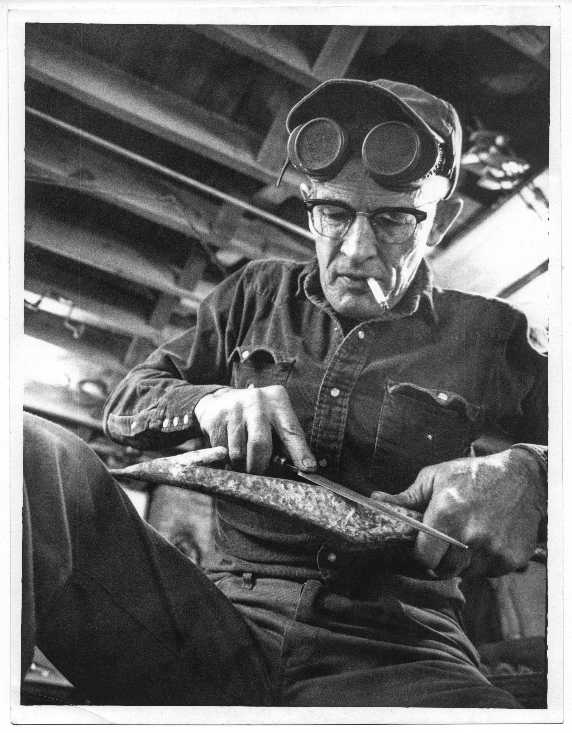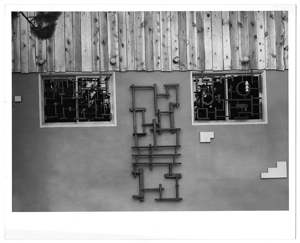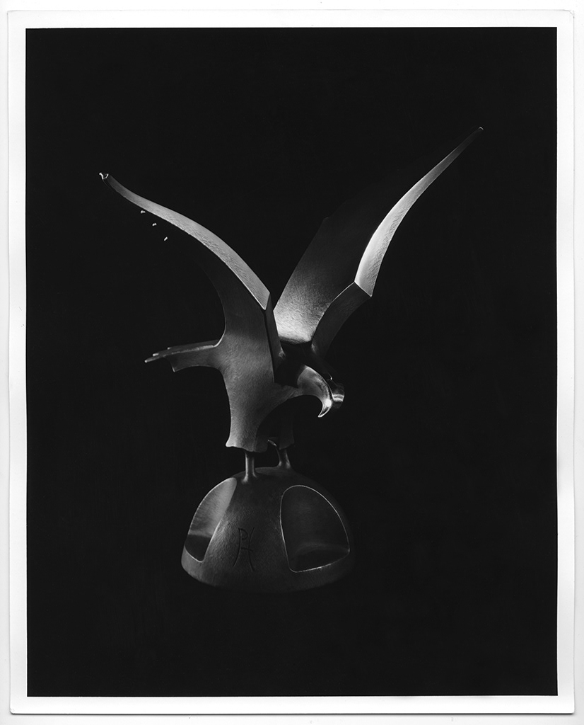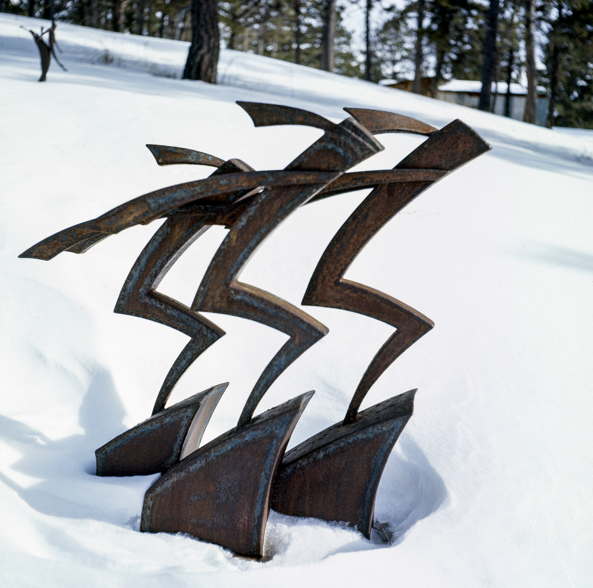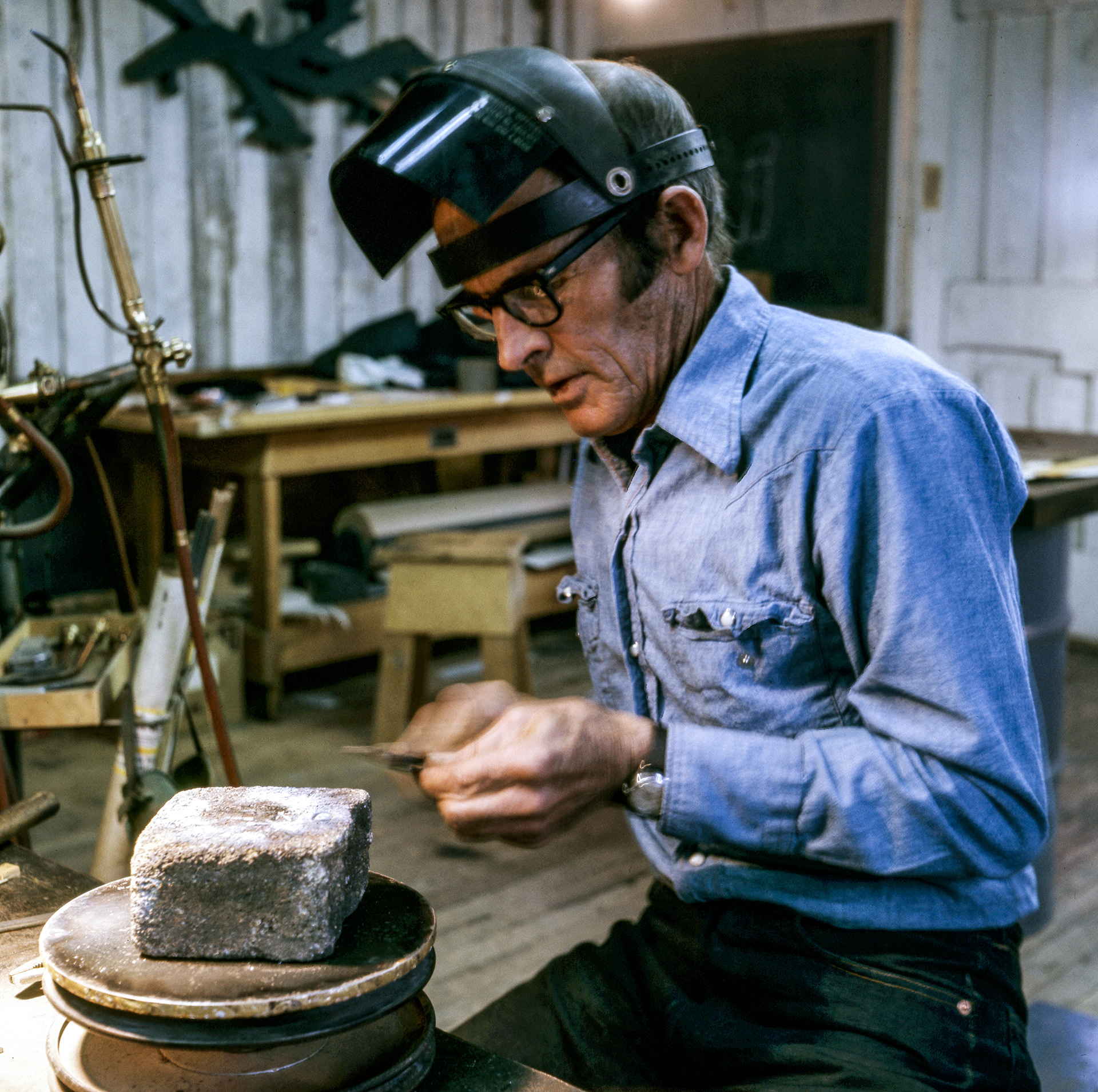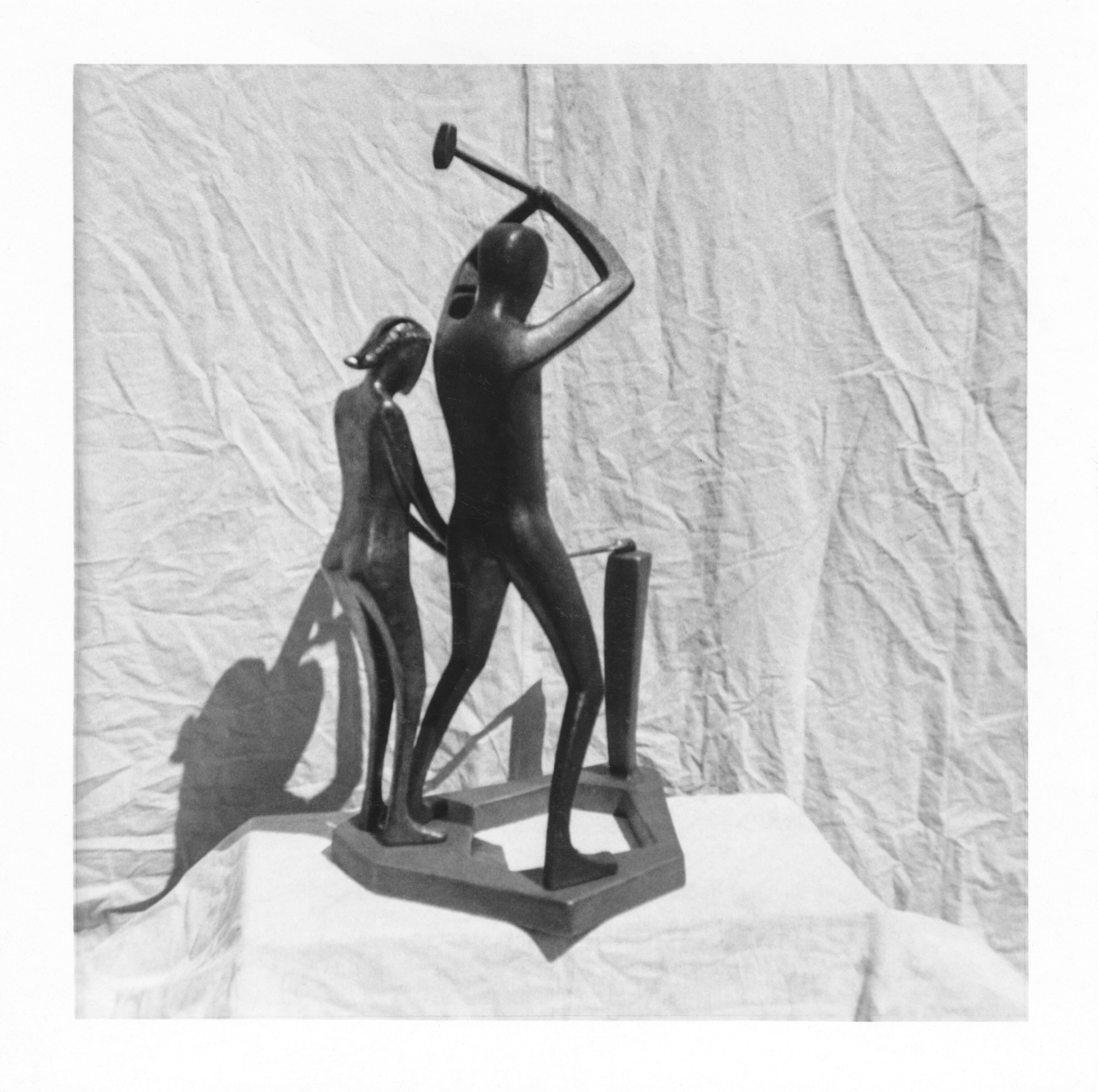 now band-saw this piece to shape. Repeat lay-out and sawing on an adjoining piece. now shape these pieces with hammer and anvil, or vise, or whatever is needed to obtain the required contours and fits. These two pieces might now be tacked together with the torch. The third piece, adjoining, now is cut out, shaped, and tacked in place on the first two pieces. This procedure continues until you have all the pieces in place. one sculpture may have an unlimited number of pieces.