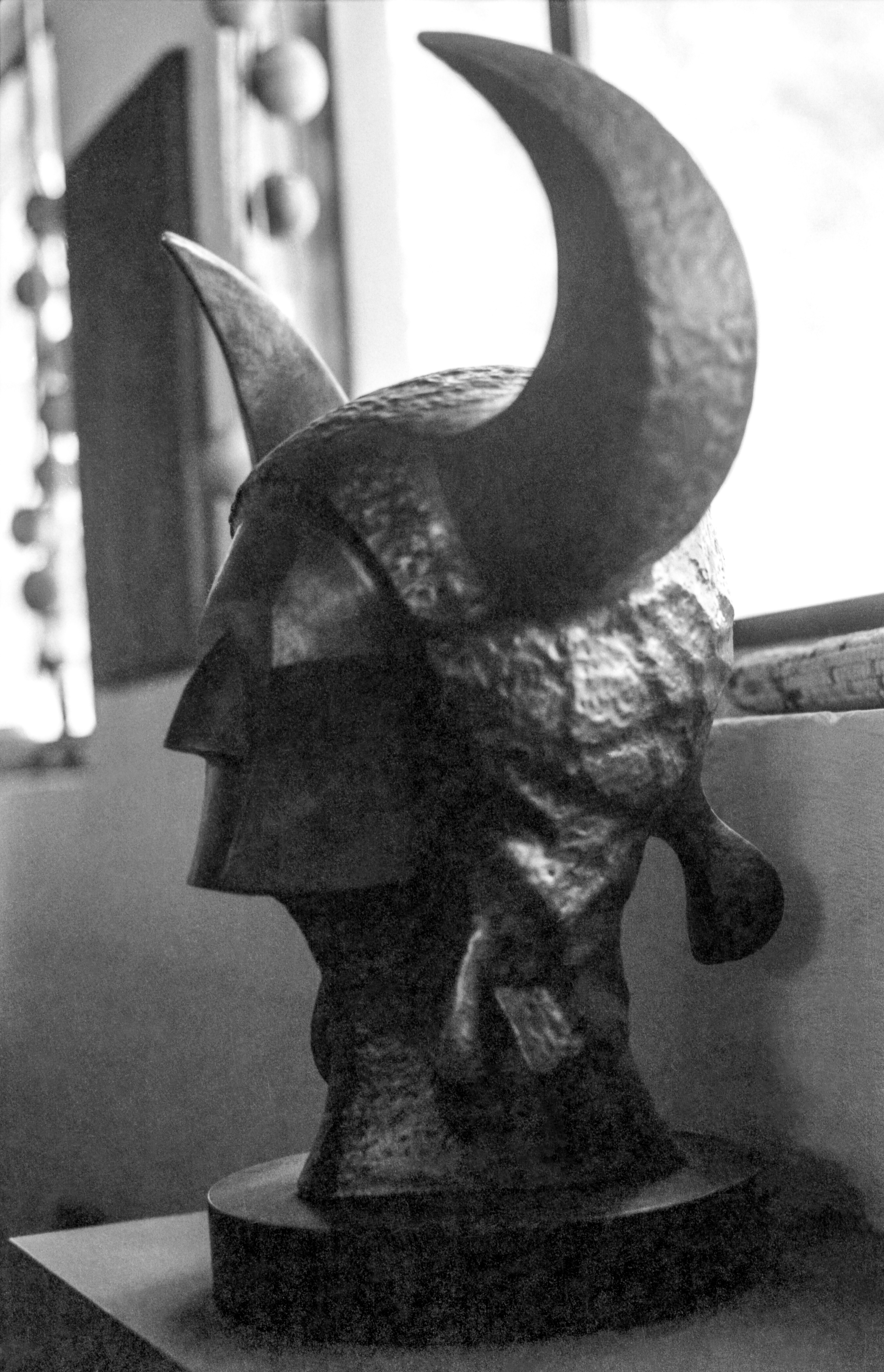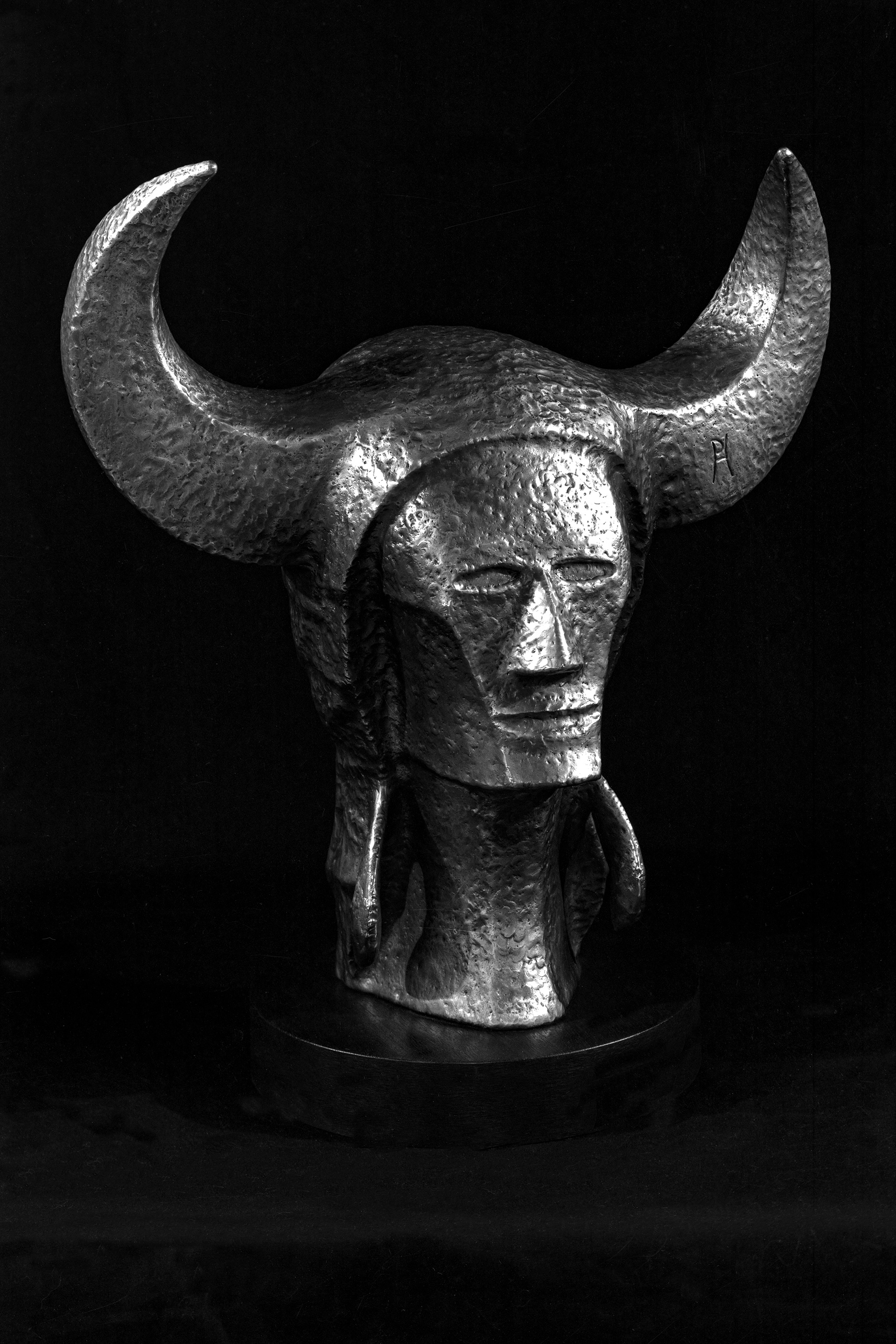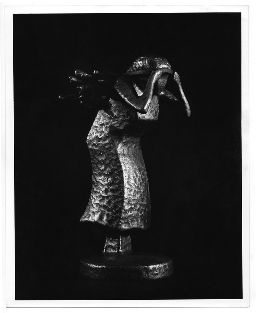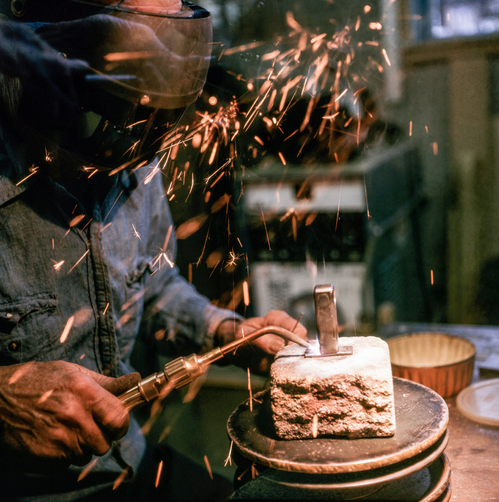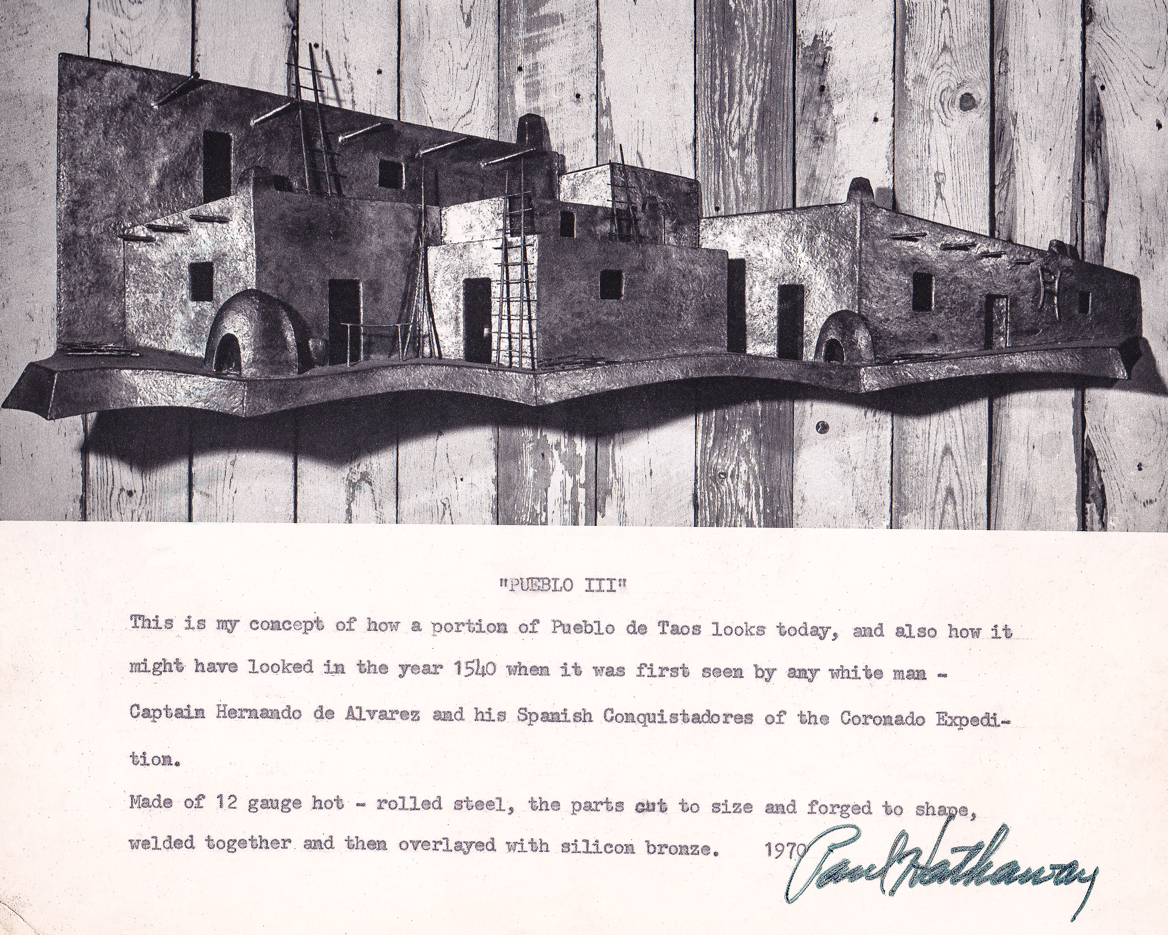 now band-saw this piece to shape. Repeat lay-out and sawing on an adjoining piece. now shape these pieces with hammer and anvil, or vise, or whatever is needed to obtain the required contours and fits. These two pieces might now be tacked together with the torch. The third piece, adjoining, now is cut out, shaped, and tacked in place on the first two pieces. This procedure continues until you have all the pieces in place. one sculpture may have an unlimited number of pieces.
