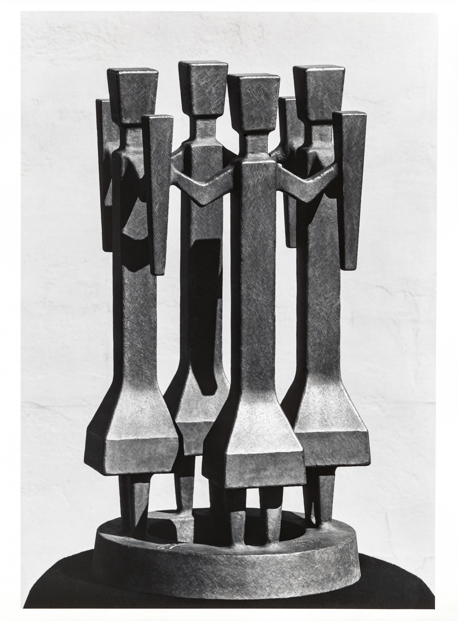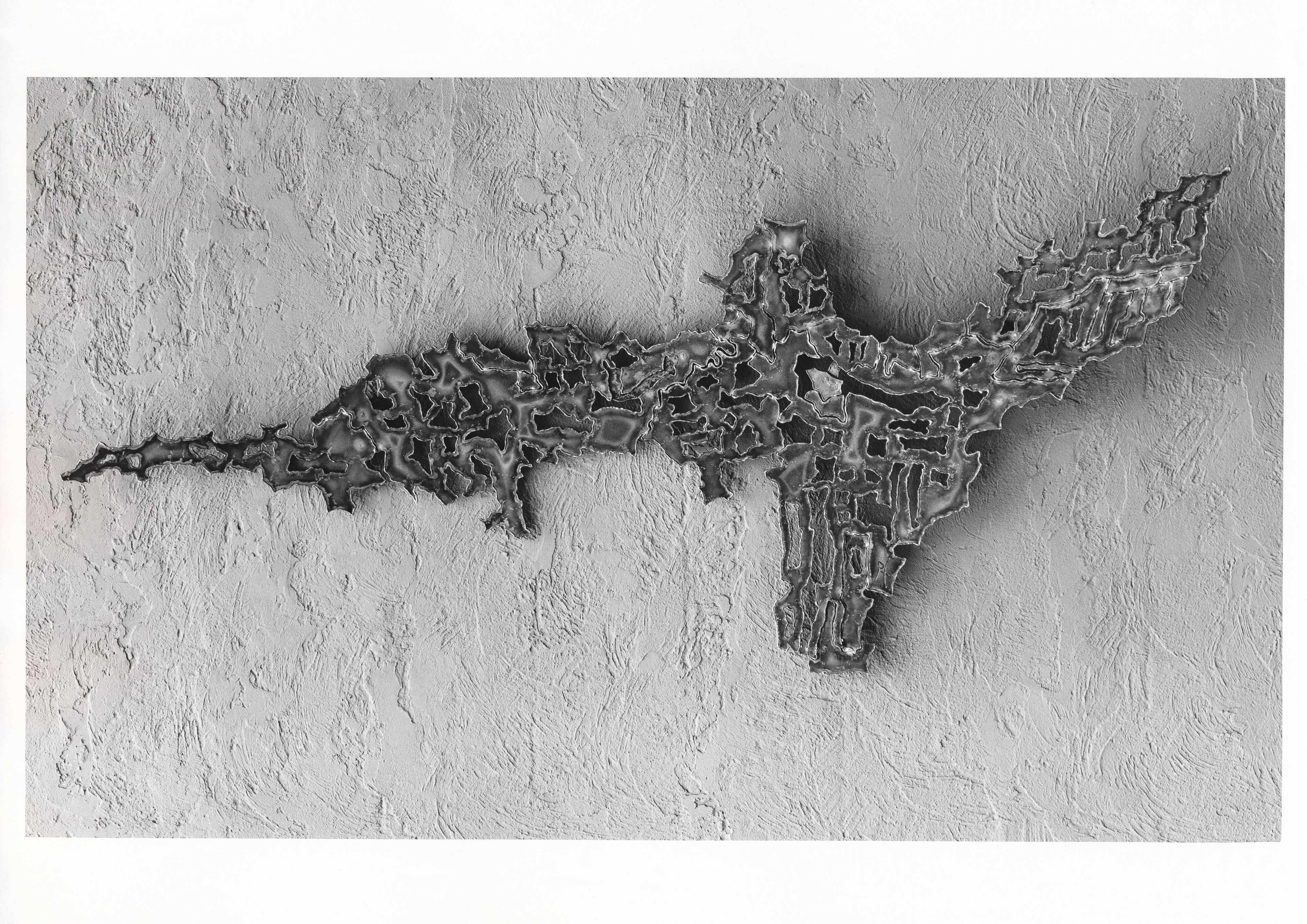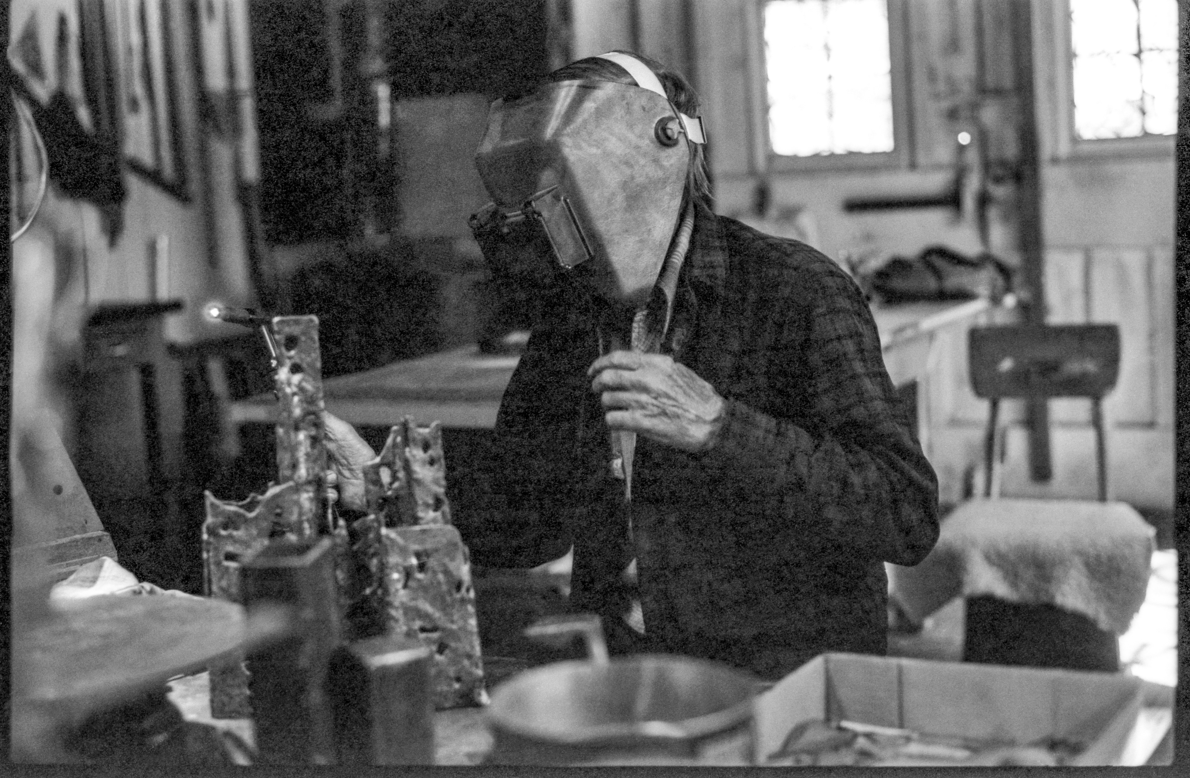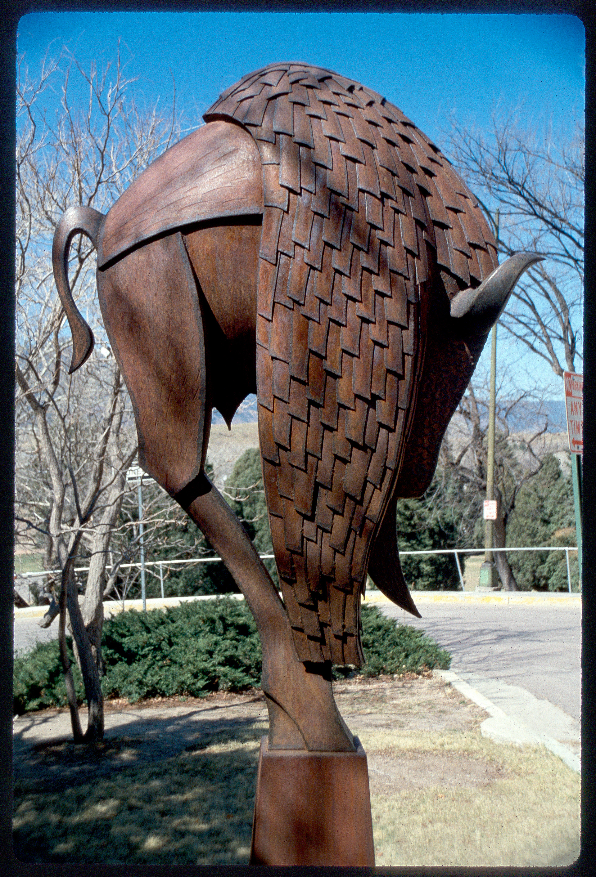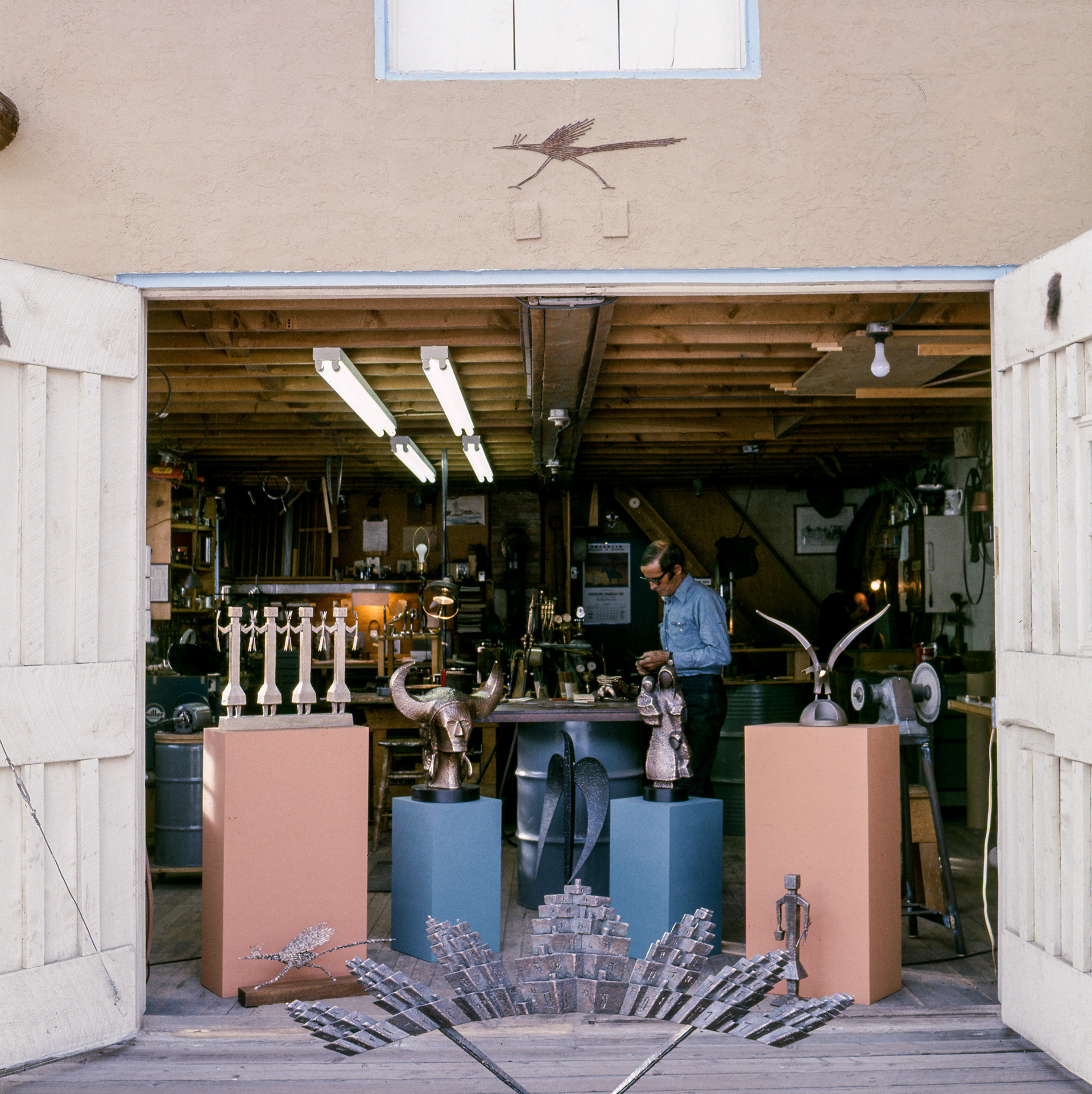 now band-saw this piece to shape. Repeat lay-out and sawing on an adjoining piece. now shape these pieces with hammer and anvil, or vise, or whatever is needed to obtain the required contours and fits. These two pieces might now be tacked together with the torch. The third piece, adjoining, now is cut out, shaped, and tacked in place on the first two pieces. This procedure continues until you have all the pieces in place. one sculpture may have an unlimited number of pieces.