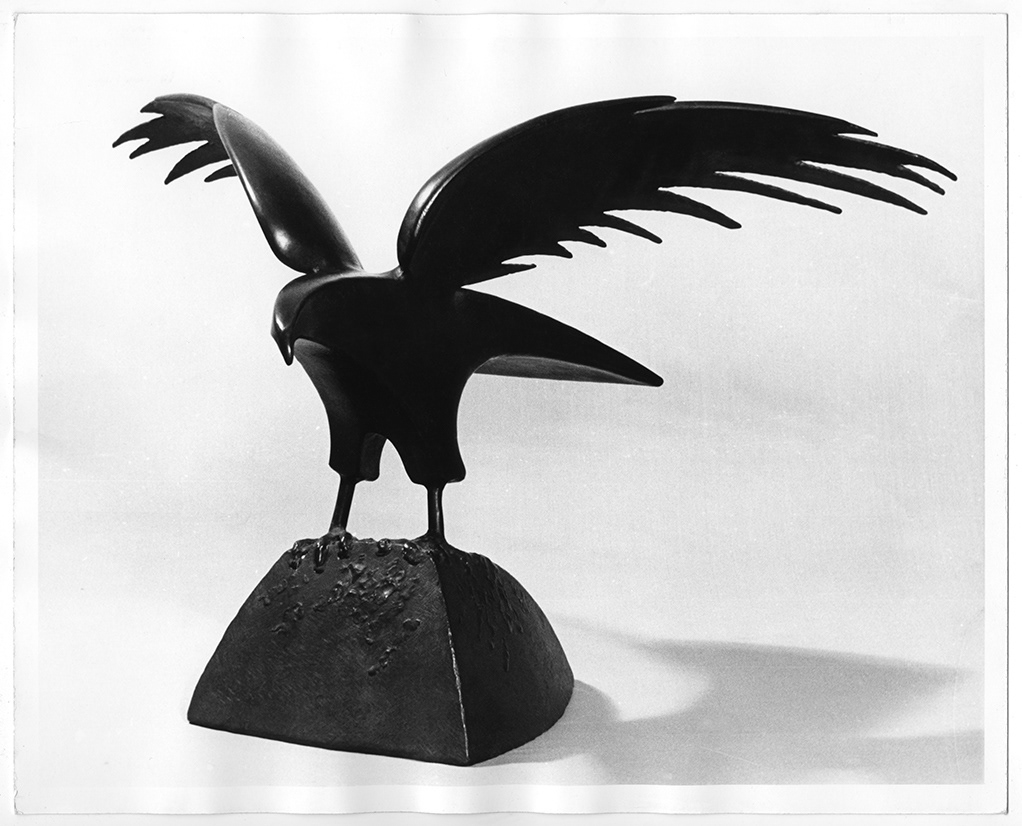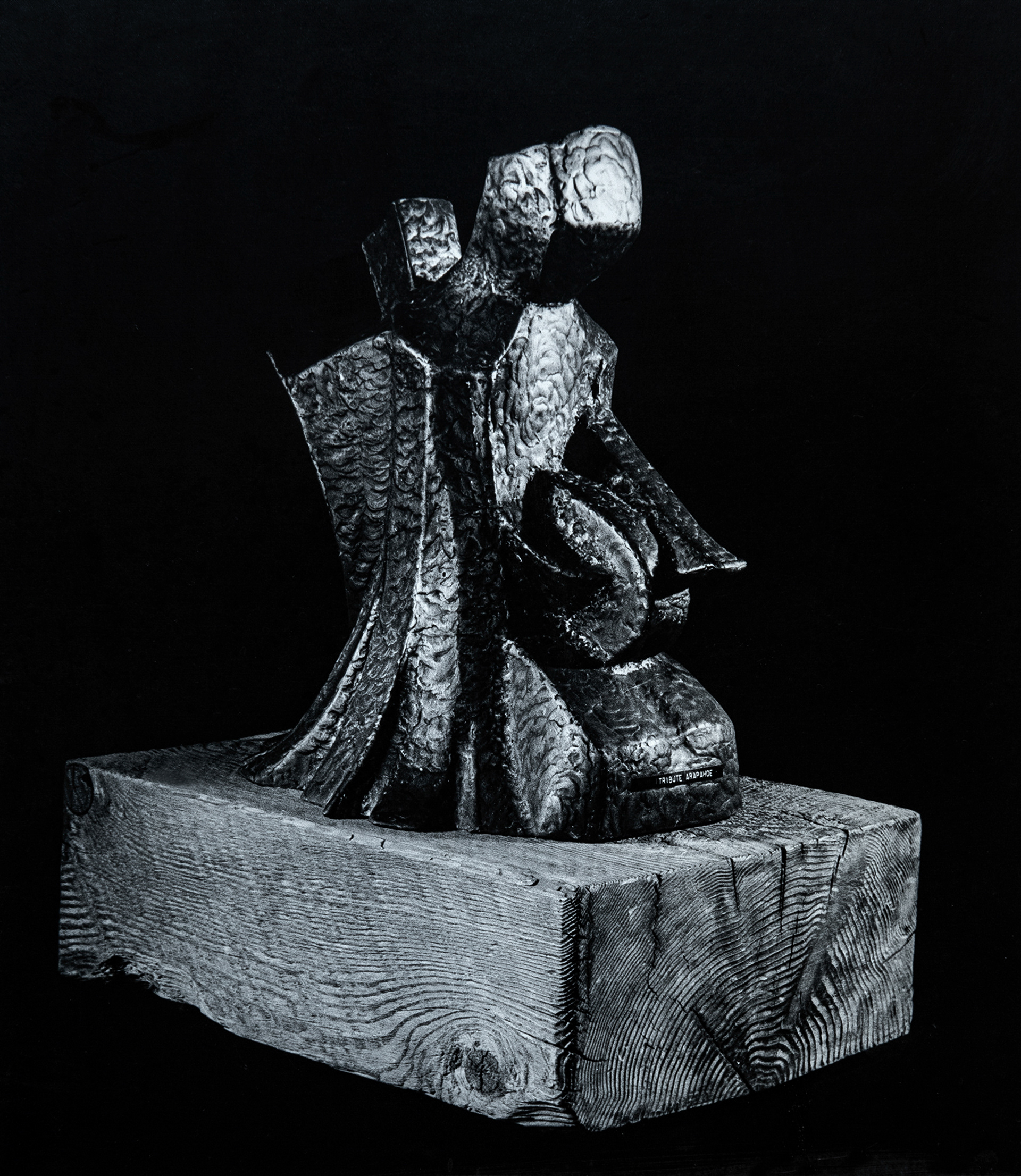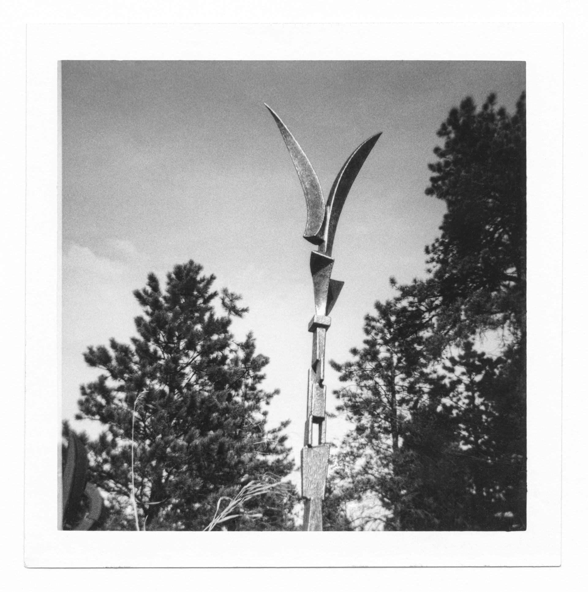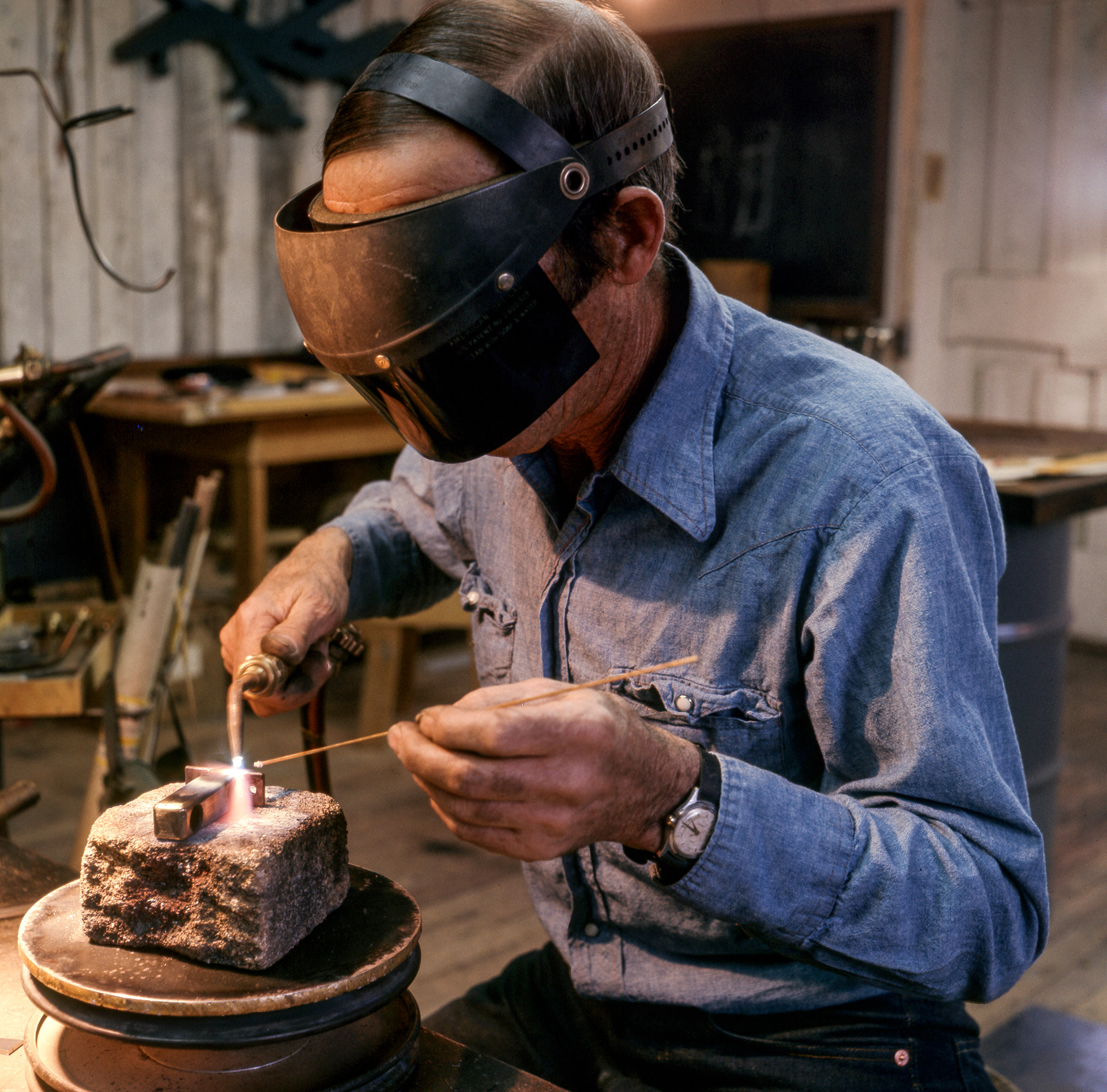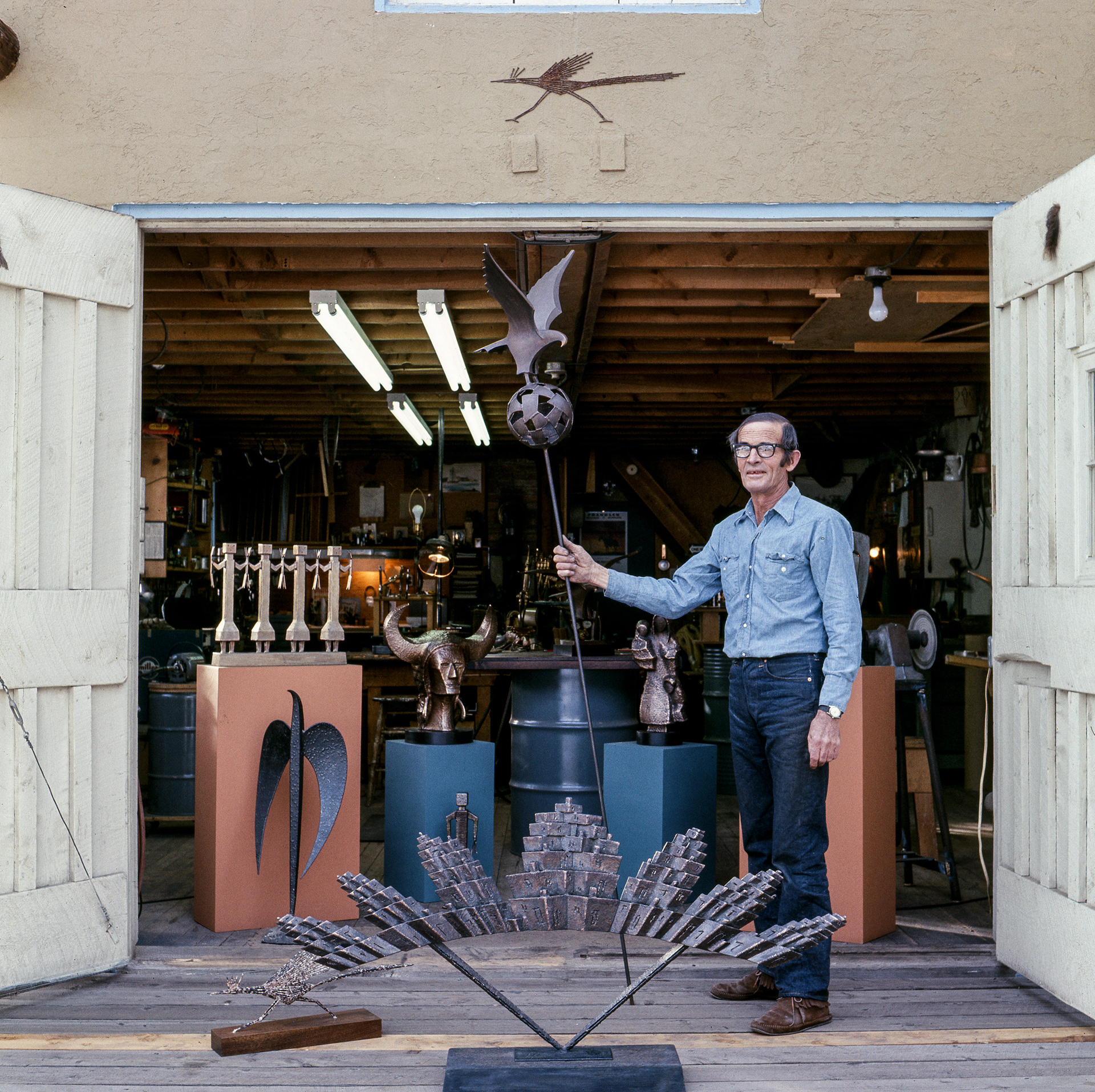 now band-saw this piece to shape. Repeat lay-out and sawing on an adjoining piece. now shape these pieces with hammer and anvil, or vise, or whatever is needed to obtain the required contours and fits. These two pieces might now be tacked together with the torch. The third piece, adjoining, now is cut out, shaped, and tacked in place on the first two pieces. This procedure continues until you have all the pieces in place. one sculpture may have an unlimited number of pieces.