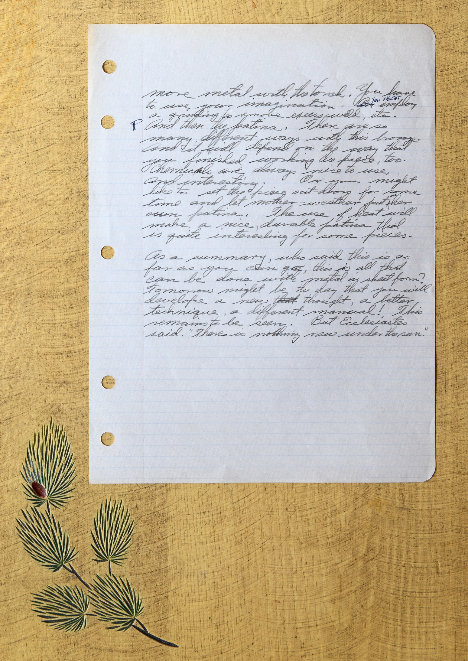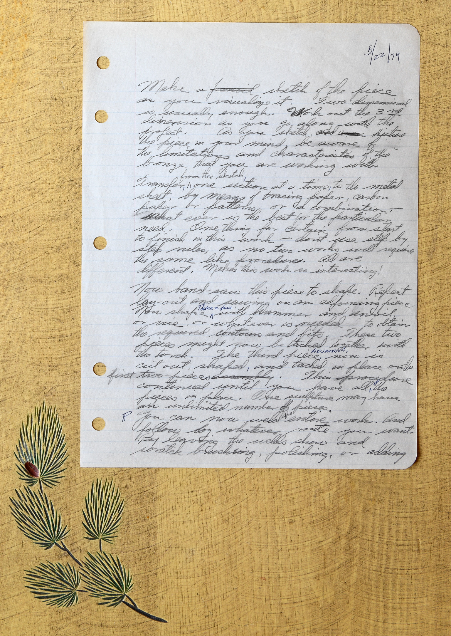 Make a sketch of the piece as you visualize it. Two dimensional is usually enough. Work out the 3rd dimension as you go along with the project. As you sketch, picture the piece in your mind, be aware of the limitations and characteristics of the bronze that you are working with.